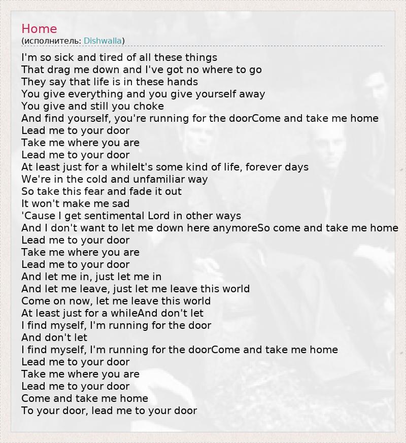 I'm so sick and tired of all these things That drag me down and I've got no where to go They say that life is in these hands You give everything and you give yourself away You give and still you choke And find yourself, you're running for the doorCome and take me home Lead me to your door Take me where you are Lead me to your door At least just for a whileIt's some kind of life, forever days We're in the cold and unfamiliar way So take this fear and fade it out It won't make me sad 'Cause I get sentimental Lord in other ways And I don't want to let me down here anymoreSo come and take me home Lead me to your door Take me where you are Lead me to your door And let me in, just let me in And let me leave, just let me leave this world Come on now, let me leave this world At least just for a whileAnd don't let I find myself, I'm running for the door And don't let I find myself, I'm running for the doorCome and take me home Lead me to your door Take me where you are Lead me to your door Come and take me home To your door, lead me to your door