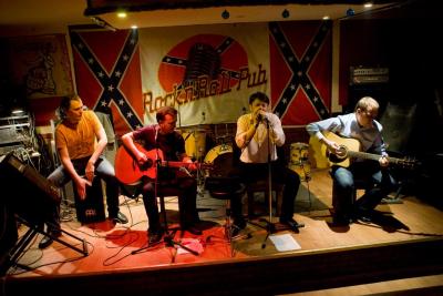 Это интересно: Московский кантри-блюзовый квартет. "Банда подвыпивших морячков", проще говоря. Кантри, блюз, рокабилли.Александр Бахирев - вокал, гитара, мандолина, слайд-гитараЮрий Соколов - губная гармоника, вокалДмитрий Кумченко - гитараАлексей Киселев - кахон.Михаил "Гремлин" Богданов - контрабаc.Эпитет "забористый" отлично характеризует этих музыкантов... продолжение