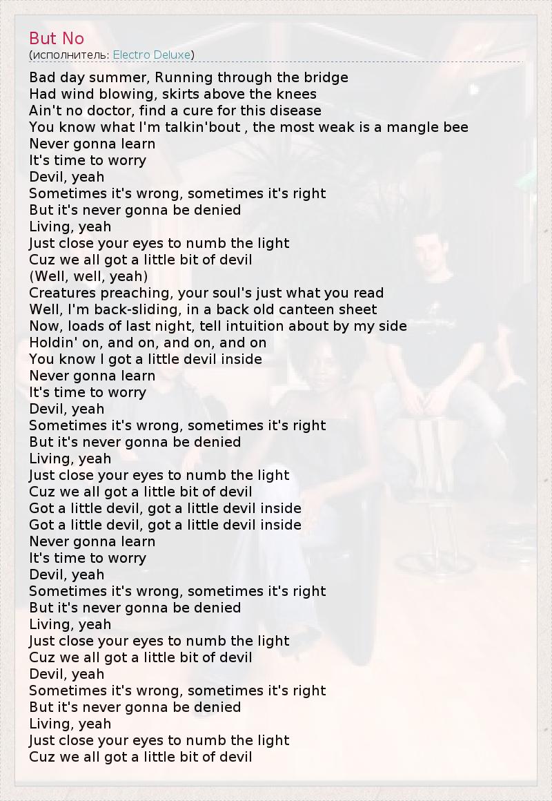 Bad day summer, Running through the bridge Had wind blowing, skirts above the knees Ain't no doctor, find a cure for this disease You know what I'm talkin'bout , the most weak is a mangle bee Never gonna learn It's time to worry Devil, yeah Sometimes it's wrong, sometimes it's right But it's never gonna be denied Living, yeah Just close your eyes to numb the light Cuz we all got a little bit of devil (Well, well, yeah) Creatures preaching, your soul's just what you read Well, I'm back-sliding, in a back old canteen sheet Now, loads of last night, tell intuition about by my side Holdin' on, and on, and on, and on You know I got a little devil inside Never gonna learn It's time to worry Devil, yeah Sometimes it's wrong, sometimes it's right But it's never gonna be denied Living, yeah Just close your eyes to numb the light Cuz we all got a little bit of devil Got a little devil, got a little devil inside Got a little devil, got a little devil inside Never gonna learn It's time to worry Devil, yeah Sometimes it's wrong, sometimes it's right But it's never gonna be denied Living, yeah Just close your eyes to numb the light Cuz we all got a little bit of devil Devil, yeah Sometimes it's wrong, sometimes it's right But it's never gonna be denied Living, yeah Just close your eyes to numb the light Cuz we all got a little bit of devil