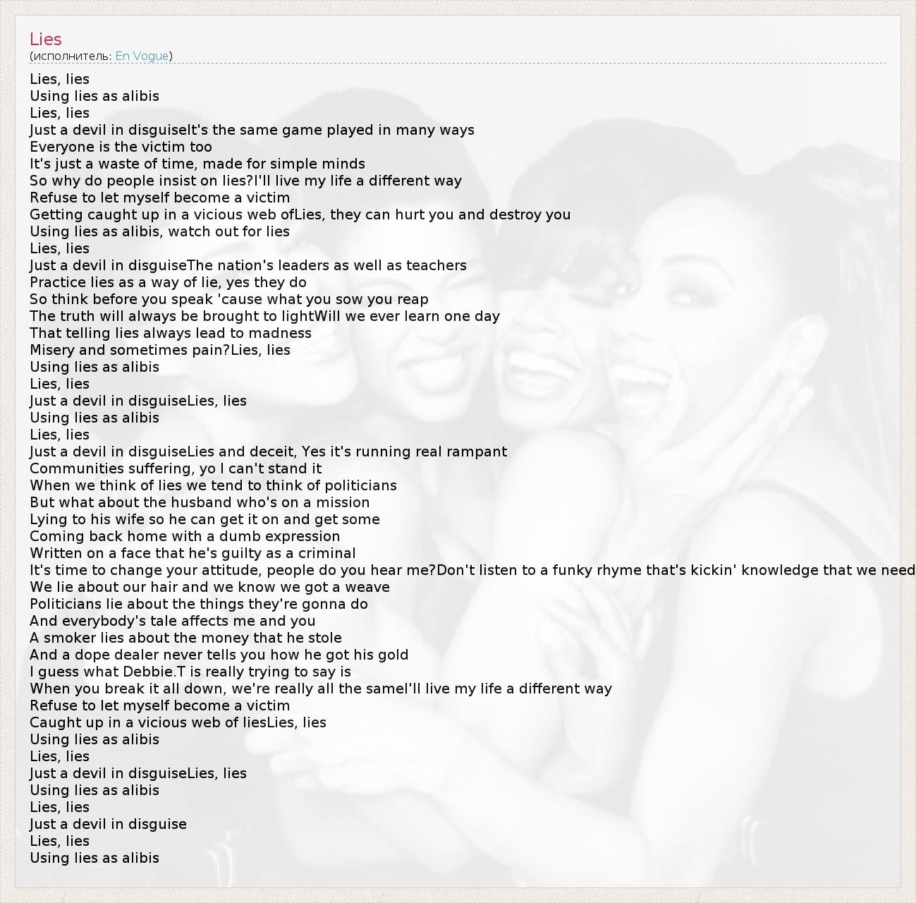 Lies, lies Using lies as alibis Lies, lies Just a devil in disguiseIt's the same game played in many ways Everyone is the victim too It's just a waste of time, made for simple minds So why do people insist on lies?I'll live my life a different way Refuse to let myself become a victim Getting caught up in a vicious web ofLies, they can hurt you and destroy you Using lies as alibis, watch out for lies Lies, lies Just a devil in disguiseThe nation's leaders as well as teachers Practice lies as a way of lie, yes they do So think before you speak 'cause what you sow you reap The truth will always be brought to lightWill we ever learn one day That telling lies always lead to madness Misery and sometimes pain?Lies, lies Using lies as alibis Lies, lies Just a devil in disguiseLies, lies Using lies as alibis Lies, lies Just a devil in disguiseLies and deceit, Yes it's running real rampant Communities suffering, yo I can't stand it When we think of lies we tend to think of politicians But what about the husband who's on a mission Lying to his wife so he can get it on and get some Coming back home with a dumb expression Written on a face that he's guilty as a criminal It's time to change your attitude, people do you hear me?Don't listen to a funky rhyme that's kickin' knowledge that we need We lie about our hair and we know we got a weave Politicians lie about the things they're gonna do And everybody's tale affects me and you A smoker lies about the money that he stole And a dope dealer never tells you how he got his gold I guess what Debbie.T is really trying to say is When you break it all down, we're really all the sameI'll live my life a different way Refuse to let myself become a victim Caught up in a vicious web of liesLies, lies Using lies as alibis Lies, lies Just a devil in disguiseLies, lies Using lies as alibis Lies, lies Just a devil in disguise Lies, lies Using lies as alibis