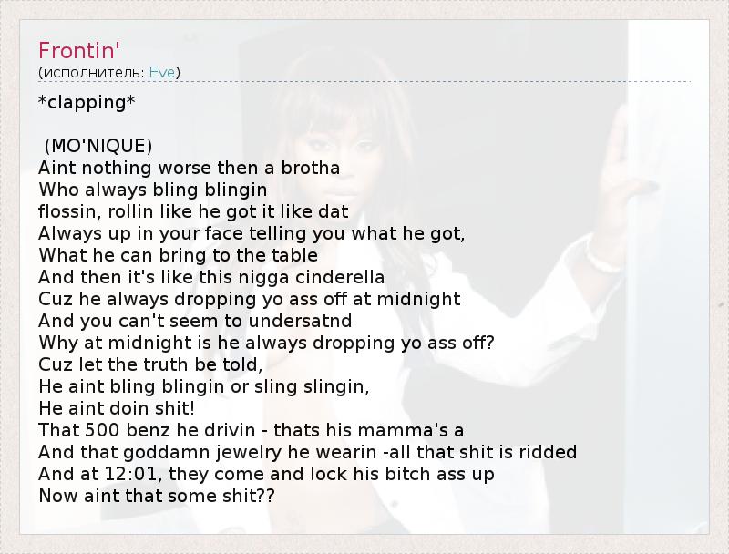 *clapping* (MO'NIQUE) Aint nothing worse then a brotha Who always bling blingin flossin, rollin like he got it like dat Always up in your face telling you what he got, What he can bring to the table And then it's like this nigga cinderella Cuz he always dropping yo ass off at midnight And you can't seem to undersatnd Why at midnight is he always dropping yo ass off? Cuz let the truth be told, He aint bling blingin or sling slingin, He aint doin shit! That 500 benz he drivin - thats his mamma's a And that goddamn jewelry he wearin -all that shit is ridded And at 12:01, they come and lock his bitch ass up Now aint that some shit??