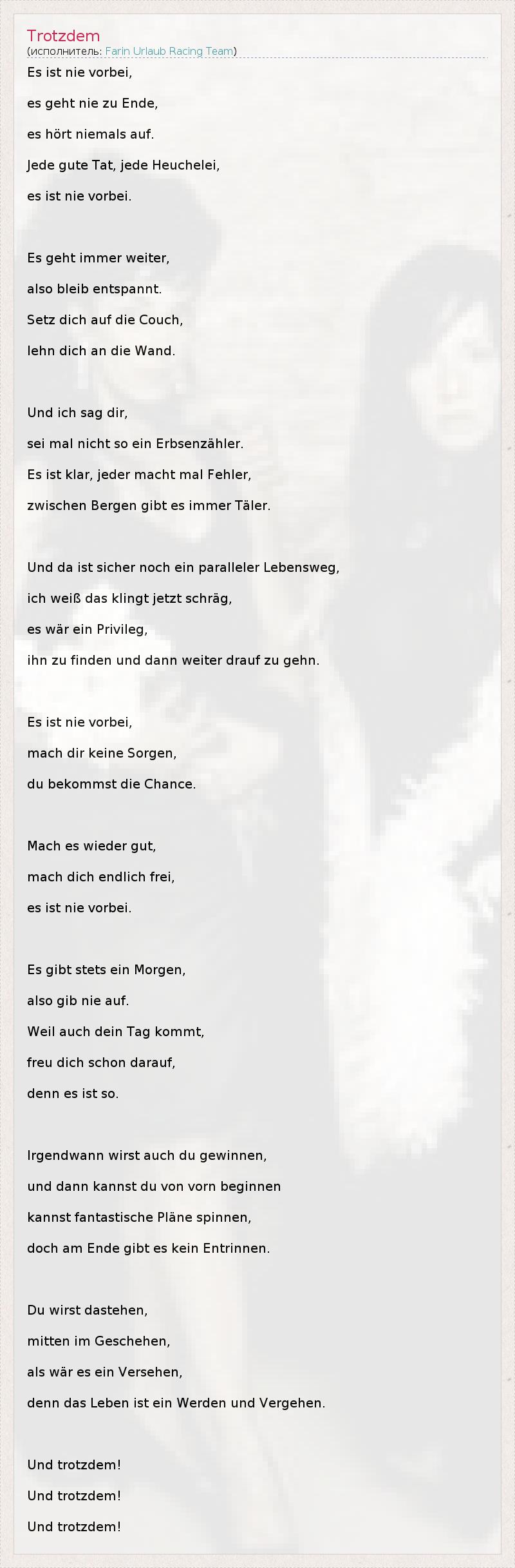 Es ist nie vorbei, es geht nie zu Ende, es hört niemals auf. Jede gute Tat, jede Heuchelei, es ist nie vorbei. Es geht immer weiter, also bleib entspannt. Setz dich auf die Couch, lehn dich an die Wand. Und ich sag dir, sei mal nicht so ein Erbsenzähler. Es ist klar, jeder macht mal Fehler, zwischen Bergen gibt es immer Täler. Und da ist sicher noch ein paralleler Lebensweg, ich weiß das klingt jetzt schräg, es wär ein Privileg, ihn zu finden und dann weiter drauf zu gehn. Es ist nie vorbei, mach dir keine Sorgen, du bekommst die Chance. Mach es wieder gut, mach dich endlich frei, es ist nie vorbei. Es gibt stets ein Morgen, also gib nie auf. Weil auch dein Tag kommt, freu dich schon darauf, denn es ist so. Irgendwann wirst auch du gewinnen, und dann kannst du von vorn beginnen kannst fantastische Pläne spinnen, doch am Ende gibt es kein Entrinnen. Du wirst dastehen, mitten im Geschehen, als wär es ein Versehen, denn das Leben ist ein Werden und Vergehen. Und trotzdem! Und trotzdem! Und trotzdem!