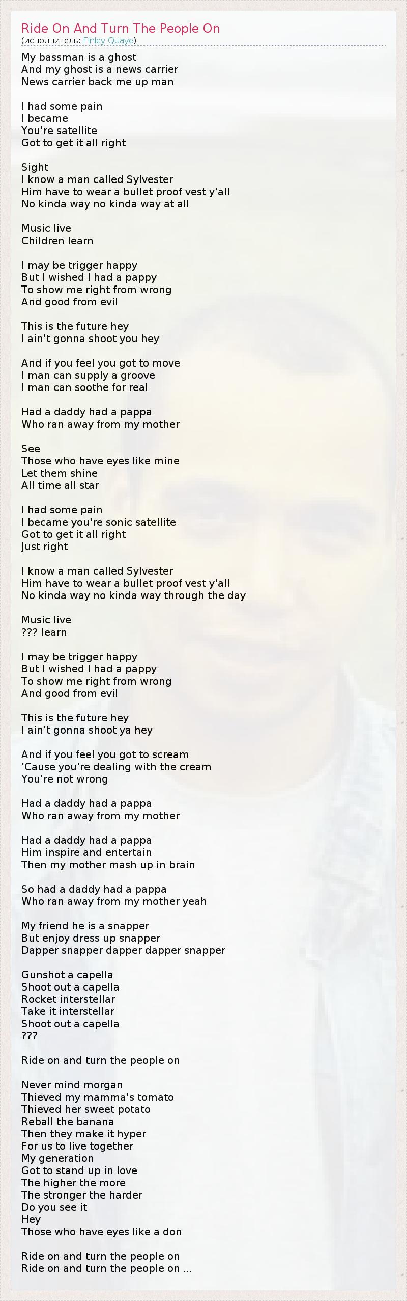 My bassman is a ghost And my ghost is a news carrier News carrier back me up man I had some pain I became You're satellite Got to get it all right Sight I know a man called Sylvester Him have to wear a bullet proof vest y'all No kinda way no kinda way at all Music live Children learn I may be trigger happy But I wished I had a pappy To show me right from wrong And good from evil This is the future hey I ain't gonna shoot you hey And if you feel you got to move I man can supply a groove I man can soothe for real Had a daddy had a pappa Who ran away from my mother See Those who have eyes like mine Let them shine All time all star I had some pain I became you're sonic satellite Got to get it all right Just right I know a man called Sylvester Him have to wear a bullet proof vest y'all No kinda way no kinda way through the day Music live ??? learn I may be trigger happy But I wished I had a pappy To show me right from wrong And good from evil This is the future hey I ain't gonna shoot ya hey And if you feel you got to scream 'Cause you're dealing with the cream You're not wrong Had a daddy had a pappa Who ran away from my mother Had a daddy had a pappa Him inspire and entertain Then my mother mash up in brain So had a daddy had a pappa Who ran away from my mother yeah My friend he is a snapper But enjoy dress up snapper Dapper snapper dapper dapper snapper Gunshot a capella Shoot out a capella Rocket interstellar Take it interstellar Shoot out a capella ??? Ride on and turn the people on Never mind morgan Thieved my mamma's tomato Thieved her sweet potato Reball the banana Then they make it hyper For us to live together My generation Got to stand up in love The higher the more The stronger the harder Do you see it Hey Those who have eyes like a don Ride on and turn the people on Ride on and turn the people on ...