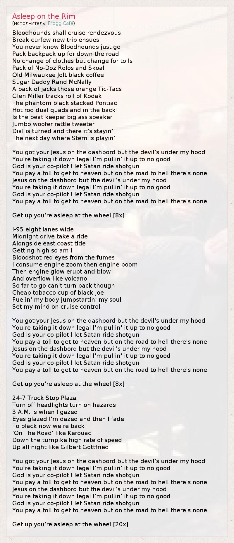 Bloodhounds shall cruise rendezvous Break curfew new trip ensues You never know Bloodhounds just go Pack backpack up for down the road No change of clothes but change for tolls Pack of No-Doz Rolos and Skoal Old Milwaukee Jolt black coffee Sugar Daddy Rand McNally A pack of jacks those orange Tic-Tacs Glen Miller tracks roll of Kodak The phantom black stacked Pontiac Hot rod dual quads and in the back Is the beat keeper big ass speaker Jumbo woofer rattle tweeter Dial is turned and there it's stayin' The next day where Stern is playin' You got your Jesus on the dashbord but the devil's under my hood You're taking it down legal I'm pullin' it up to no good God is your co-pilot I let Satan ride shotgun You pay a toll to get to heaven but on the road to hell there's none Jesus on the dashbord but the devil's under my hood You're taking it down legal I'm pullin' it up to no good God is your co-pilot I let Satan ride shotgun You pay a toll to get to heaven but on the road to hell there's none Get up you're asleep at the wheel [8x] I-95 eight lanes wide Midnight drive take a ride Alongside east coast tide Getting high so am I Bloodshot red eyes from the fumes I consume engine zoom then engine boom Then engine glow erupt and blow And overflow like volcano So far to go can't turn back though Cheap tobacco cup of black Joe Fuelin' my body jumpstartin' my soul Set my mind on cruise control You got your Jesus on the dashbord but the devil's under my hood You're taking it down legal I'm pullin' it up to no good God is your co-pilot I let Satan ride shotgun You pay a toll to get to heaven but on the road to hell there's none Jesus on the dashbord but the devil's under my hood You're taking it down legal I'm pullin' it up to no good God is your co-pilot I let Satan ride shotgun You pay a toll to get to heaven but on the road to hell there's none Get up you're asleep at the wheel [8x] 24-7 Truck Stop Plaza Turn off headlights turn on hazards 3 A.M. is when I gazed Eyes glazed I'm dazed and then I fade To black now we're back 'On The Road' like Kerouac Down the turnpike high rate of speed Up all night like Gilbert Gottfried You got your Jesus on the dashbord but the devil's under my hood You're taking it down legal I'm pullin' it up to no good God is your co-pilot I let Satan ride shotgun You pay a toll to get to heaven but on the road to hell there's none Jesus on the dashbord but the devil's under my hood You're taking it down legal I'm pullin' it up to no good God is your co-pilot I let Satan ride shotgun You pay a toll to get to heaven but on the road to hell there's none Get up you're asleep at the wheel [20x]