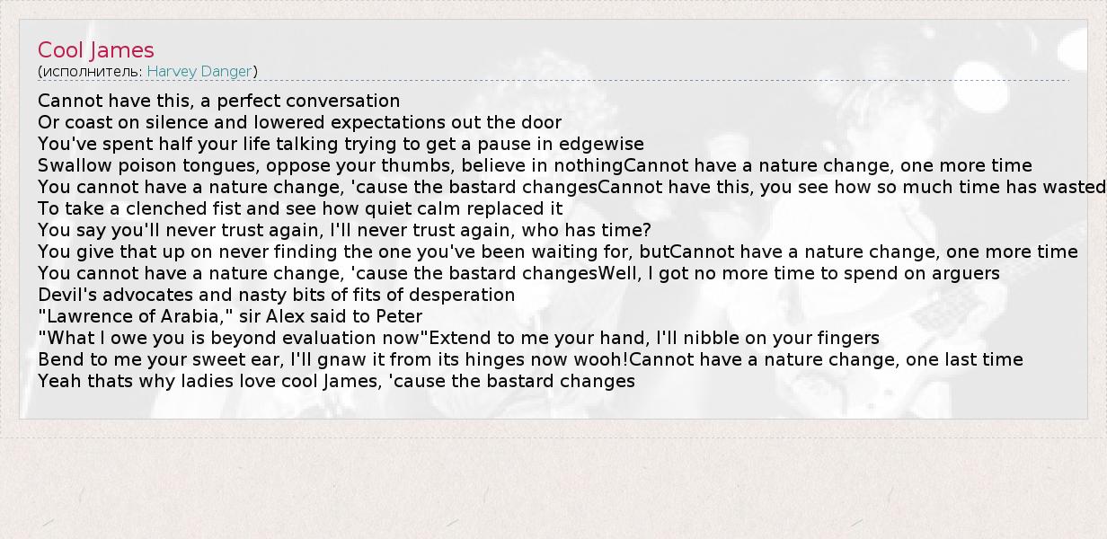 Это интересно:Альтернативный поп-квартет Harvey Danger был сформирован в Сиэтле в 1994 году в Университете штата Вашингтон из студентов Шон Нельсон (вокал), Джефф Лин (гитара), Аарон Хаффмана (бас) и Эван Sult (ударные). Вначале они просто подряжались играть кавер-версий своих любимых песен на вечеринках. В 1996 году они объединились с известным местным производителем Джоном Гудмэнсоном (John Goodmanson) в записи треков,... продолжение