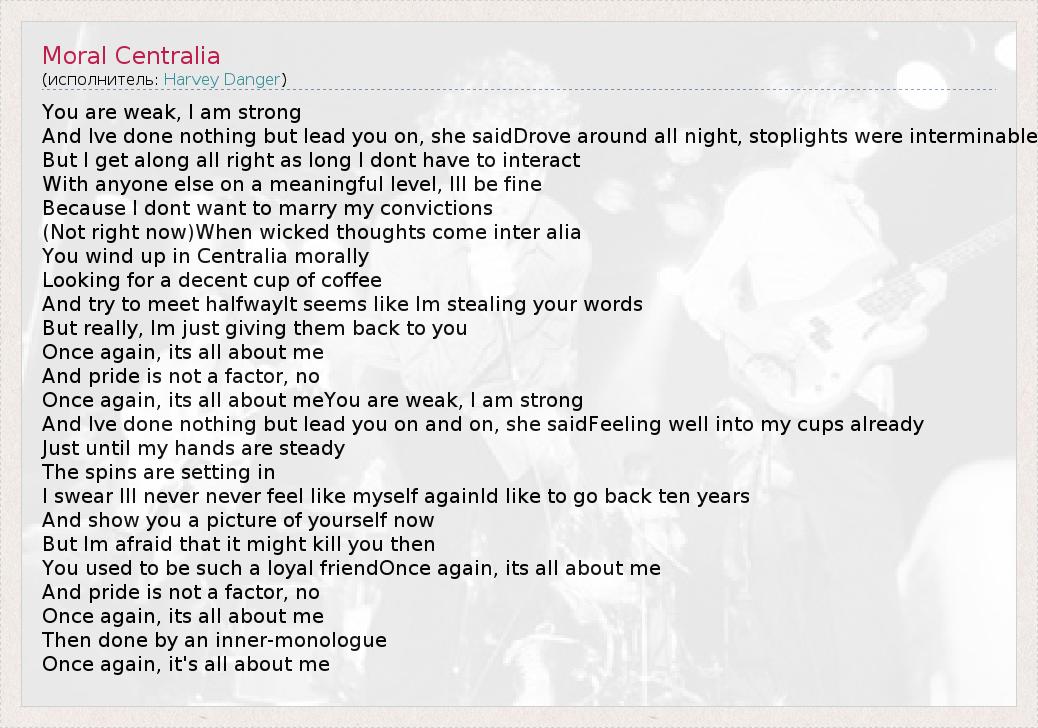 You are weak, I am strong And Ive done nothing but lead you on, she saidDrove around all night, stoplights were interminable But I get along all right as long I dont have to interact With anyone else on a meaningful level, Ill be fine Because I dont want to marry my convictions (Not right now)When wicked thoughts come inter alia You wind up in Centralia morally Looking for a decent cup of coffee And try to meet halfwayIt seems like Im stealing your words But really, Im just giving them back to you Once again, its all about me And pride is not a factor, no Once again, its all about meYou are weak, I am strong And Ive done nothing but lead you on and on, she saidFeeling well into my cups already Just until my hands are steady The spins are setting in I swear Ill never never feel like myself againId like to go back ten years And show you a picture of yourself now But Im afraid that it might kill you then You used to be such a loyal friendOnce again, its all about me And pride is not a factor, no Once again, its all about me Then done by an inner-monologue Once again, it's all about me