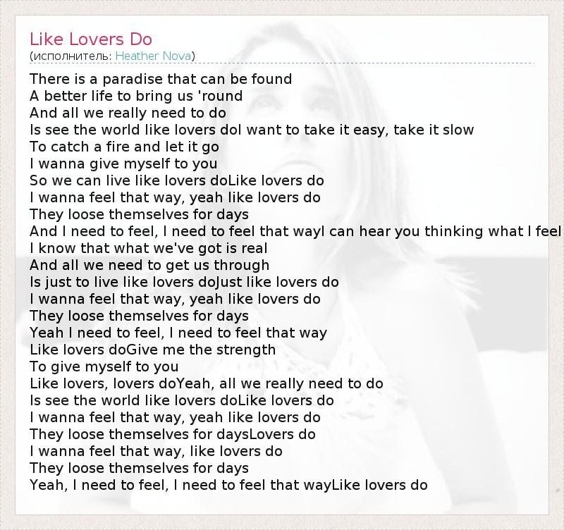 There is a paradise that can be found A better life to bring us 'round And all we really need to do Is see the world like lovers doI want to take it easy, take it slow To catch a fire and let it go I wanna give myself to you So we can live like lovers doLike lovers do I wanna feel that way, yeah like lovers do They loose themselves for days And I need to feel, I need to feel that wayI can hear you thinking what I feel I know that what we've got is real And all we need to get us through Is just to live like lovers doJust like lovers do I wanna feel that way, yeah like lovers do They loose themselves for days Yeah I need to feel, I need to feel that way Like lovers doGive me the strength To give myself to you Like lovers, lovers doYeah, all we really need to do Is see the world like lovers doLike lovers do I wanna feel that way, yeah like lovers do They loose themselves for daysLovers do I wanna feel that way, like lovers do They loose themselves for days Yeah, I need to feel, I need to feel that wayLike lovers do