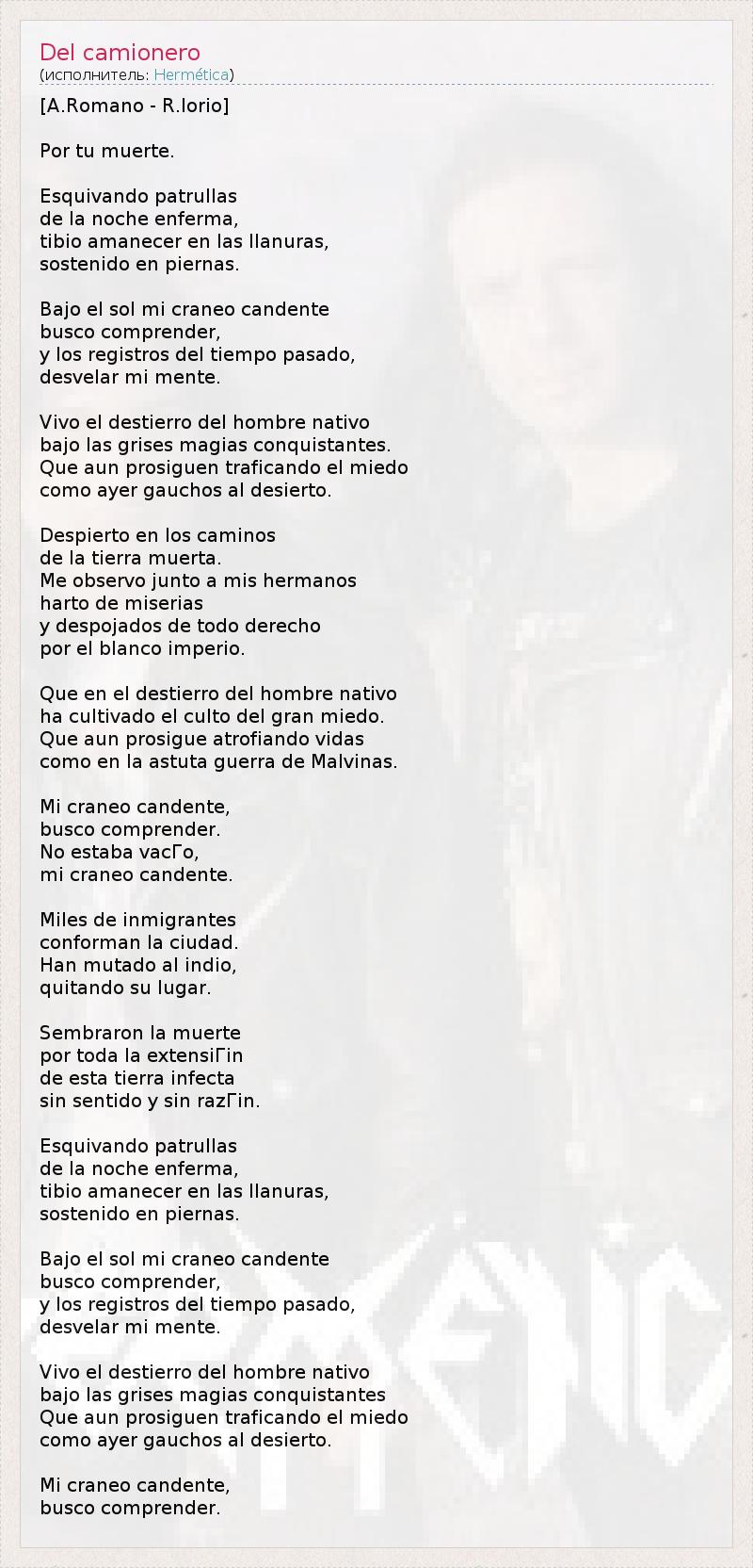 [A.Romano - R.Iorio] Por tu muerte. Esquivando patrullas de la noche enferma, tibio amanecer en las llanuras, sostenido en piernas. Bajo el sol mi craneo candente busco comprender, y los registros del tiempo pasado, desvelar mi mente. Vivo el destierro del hombre nativo bajo las grises magias conquistantes. Que aun prosiguen traficando el miedo como ayer gauchos al desierto. Despierto en los caminos de la tierra muerta. Me observo junto a mis hermanos harto de miserias y despojados de todo derecho por el blanco imperio. Que en el destierro del hombre nativo ha cultivado el culto del gran miedo. Que aun prosigue atrofiando vidas como en la astuta guerra de Malvinas. Mi craneo candente, busco comprender. No estaba vacГo, mi craneo candente. Miles de inmigrantes conforman la ciudad. Han mutado al indio, quitando su lugar. Sembraron la muerte por toda la extensiГіn de esta tierra infecta sin sentido y sin razГіn. Esquivando patrullas de la noche enferma, tibio amanecer en las llanuras, sostenido en piernas. Bajo el sol mi craneo candente busco comprender, y los registros del tiempo pasado, desvelar mi mente. Vivo el destierro del hombre nativo bajo las grises magias conquistantes Que aun prosiguen traficando el miedo como ayer gauchos al desierto. Mi craneo candente, busco comprender.