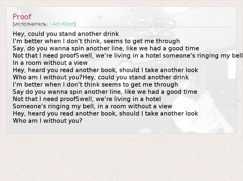 Hey, could you stand another drink I'm better when I don't think, seems to get me through Say, do you wanna spin another line, like we had a good time Not that I need proofSwell, we're living in a hotel someone's ringing my bell In a room without a view Hey, heard you read another book, should I take another look Who am I without you?Hey, could you stand another drink I'm better when I don't think seems to get me through Say do you wanna spin another line, like we had a good time Not that I need proofSwell, we're living in a hotel Someone's ringing my bell, in a room without a view Hey, heard you read another book, should I take another look Who am I without you?