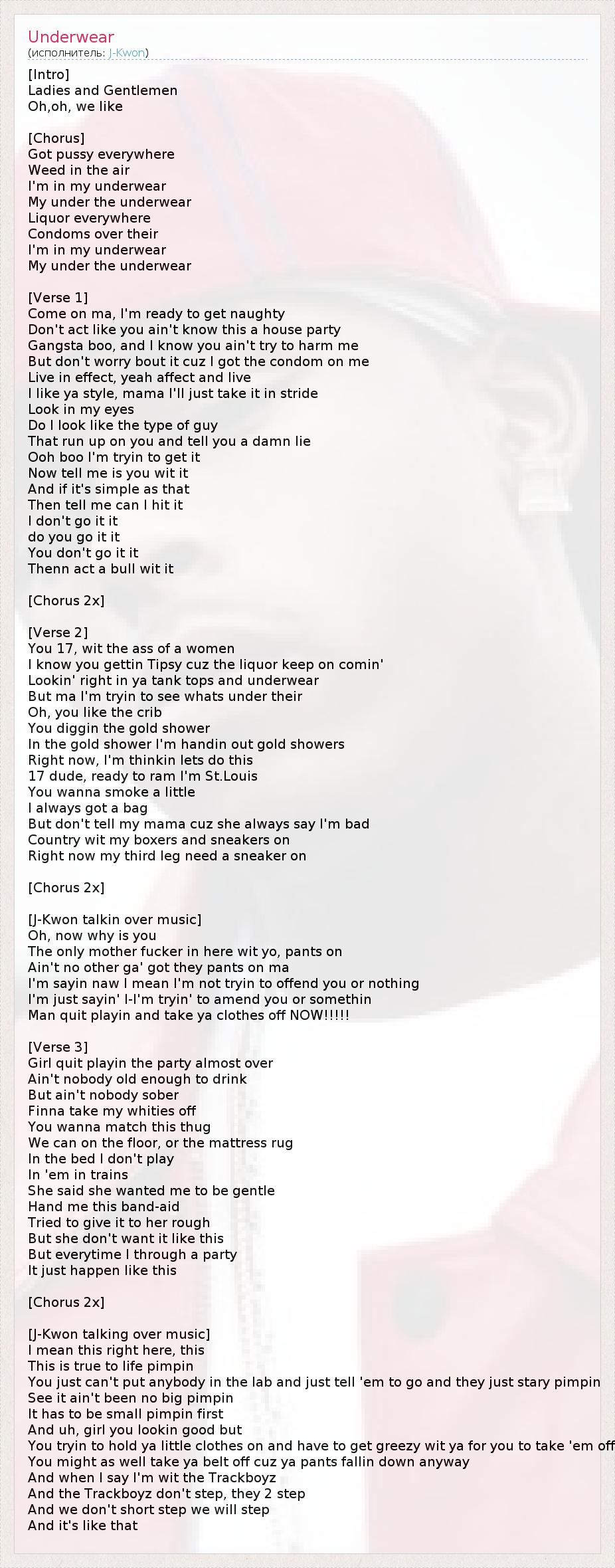 [Intro] Ladies and Gentlemen Oh,oh, we like [Chorus] Got pussy everywhere Weed in the air I'm in my underwear My under the underwear Liquor everywhere Condoms over their I'm in my underwear My under the underwear [Verse 1] Come on ma, I'm ready to get naughty Don't act like you ain't know this a house party Gangsta boo, and I know you ain't try to harm me But don't worry bout it cuz I got the condom on me Live in effect, yeah affect and live I like ya style, mama I'll just take it in stride Look in my eyes Do I look like the type of guy That run up on you and tell you a damn lie Ooh boo I'm tryin to get it Now tell me is you wit it And if it's simple as that Then tell me can I hit it I don't go it it do you go it it You don't go it it Thenn act a bull wit it [Chorus 2x] [Verse 2] You 17, wit the ass of a women I know you gettin Tipsy cuz the liquor keep on comin' Lookin' right in ya tank tops and underwear But ma I'm tryin to see whats under their Oh, you like the crib You diggin the gold shower In the gold shower I'm handin out gold showers Right now, I'm thinkin lets do this 17 dude, ready to ram I'm St.Louis You wanna smoke a little I always got a bag But don't tell my mama cuz she always say I'm bad Country wit my boxers and sneakers on Right now my third leg need a sneaker on [Chorus 2x] [J-Kwon talkin over music] Oh, now why is you The only mother fucker in here wit yo, pants on Ain't no other ga' got they pants on ma I'm sayin naw I mean I'm not tryin to offend you or nothing I'm just sayin' I-I'm tryin' to amend you or somethin Man quit playin and take ya clothes off NOW!!!!! [Verse 3] Girl quit playin the party almost over Ain't nobody old enough to drink But ain't nobody sober Finna take my whities off You wanna match this thug We can on the floor, or the mattress rug In the bed I don't play In 'em in trains She said she wanted me to be gentle Hand me this band-aid Tried to give it to her rough But she don't want it like this But everytime I through a party It just happen like this [Chorus 2x] [J-Kwon talking over music] I mean this right here, this This is true to life pimpin You just can't put anybody in the lab and just tell 'em to go and they just stary pimpin See it ain't been no big pimpin It has to be small pimpin first And uh, girl you lookin good but You tryin to hold ya little clothes on and have to get greezy wit ya for you to take 'em off You might as well take ya belt off cuz ya pants fallin down anyway And when I say I'm wit the Trackboyz And the Trackboyz don't step, they 2 step And we don't short step we will step And it's like that
