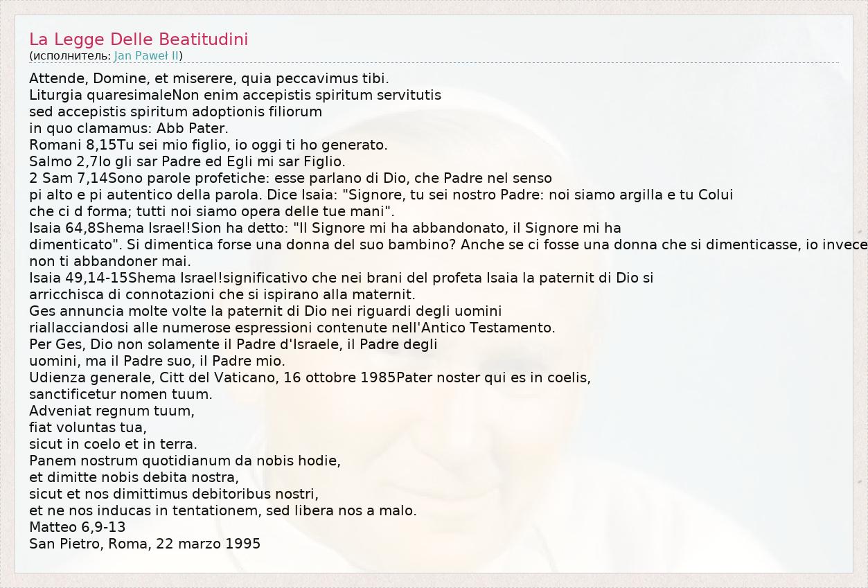 Attende, Domine, et miserere, quia peccavimus tibi. Liturgia quaresimaleNon enim accepistis spiritum servitutis sed accepistis spiritum adoptionis filiorum in quo clamamus: Abb Pater. Romani 8,15Tu sei mio figlio, io oggi ti ho generato. Salmo 2,7Io gli sar Padre ed Egli mi sar Figlio. 2 Sam 7,14Sono parole profetiche: esse parlano di Dio, che Padre nel senso pi alto e pi autentico della parola. Dice Isaia: "Signore, tu sei nostro Padre: noi siamo argilla e tu Colui che ci d forma; tutti noi siamo opera delle tue mani". Isaia 64,8Shema Israel!Sion ha detto: "Il Signore mi ha abbandonato, il Signore mi ha dimenticato". Si dimentica forse una donna del suo bambino? Anche se ci fosse una donna che si dimenticasse, io invece non ti abbandoner mai. Isaia 49,14-15Shema Israel!significativo che nei brani del profeta Isaia la paternit di Dio si arricchisca di connotazioni che si ispirano alla maternit. Ges annuncia molte volte la paternit di Dio nei riguardi degli uomini riallacciandosi alle numerose espressioni contenute nell'Antico Testamento. Per Ges, Dio non solamente il Padre d'Israele, il Padre degli uomini, ma il Padre suo, il Padre mio. Udienza generale, Citt del Vaticano, 16 ottobre 1985Pater noster qui es in coelis, sanctificetur nomen tuum. Adveniat regnum tuum, fiat voluntas tua, sicut in coelo et in terra. Panem nostrum quotidianum da nobis hodie, et dimitte nobis debita nostra, sicut et nos dimittimus debitoribus nostri, et ne nos inducas in tentationem, sed libera nos a malo. Matteo 6,9-13 San Pietro, Roma, 22 marzo 1995