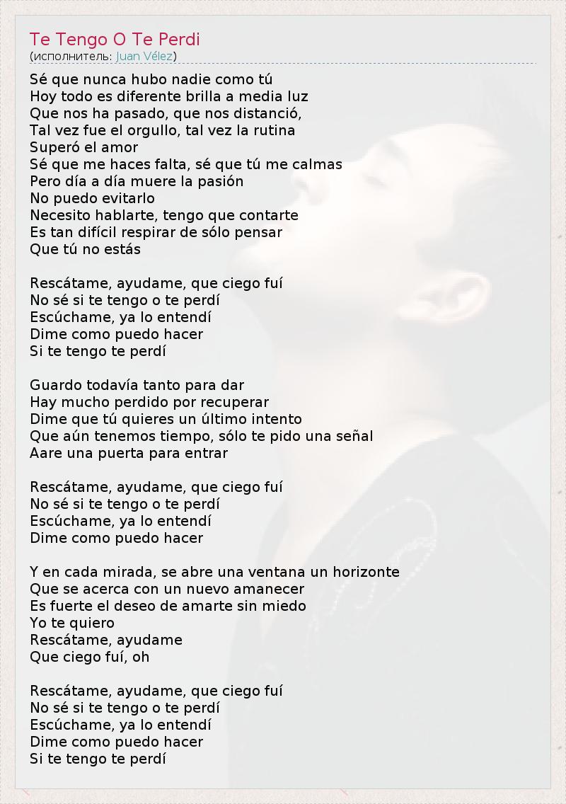 Се Que Nunca HUBO Nadie Комо tú Хой TODO эс Diferente BrillaСМИ Лус Que NOS га Pasado , Que NOS distanció , Таль Чавес ФРУ эль Orgullo , Таль Чавес ла Рутина Supero эль амор Се Que меня haces Falta , sé Que tú меня calmas Перо díadía muere ла Pasión Нет puedo evitarlo Necesito hablarte , Тенго Que contarte Es загар difícil respirar De Solo Pensar Que tú нет Estas Rescátame , Ayudame , Que Сьего Fui Нет sé си те Тенго о те perdí Escúchame , я вот entendí Dime Como puedo Hacer Si те Тенго те perdí Guardo todavía танто пункт дар Hay мучо Пердидо POR recuperar Dime Que tú quieres ип Ultimo intento Que Аун tenemos Tiempo , соло те Pido уна señal Ааре уна Пуэрта пункт entrar Rescátame , Ayudame , Que Сьего Fui Нет sé си те Тенго о те perdí Escúchame , я вот entendí Dime Como puedo Hacer Y ан Када Mirada , себе Abre уна Вентана ООН Оризонти Que себе acerca кон ООН Нуэво Amanecer Es фуэрте эль Deseo де Amarte грех Miedo Йо тэ Quiero Rescátame , Ayudame Que Сьего Fui , о Rescátame , Ayudame , Que Сьего Fui Нет sé си те Тенго о те perdí Escúchame , я вот entendí Dime Como puedo Hacer Si те Тенго те perdí