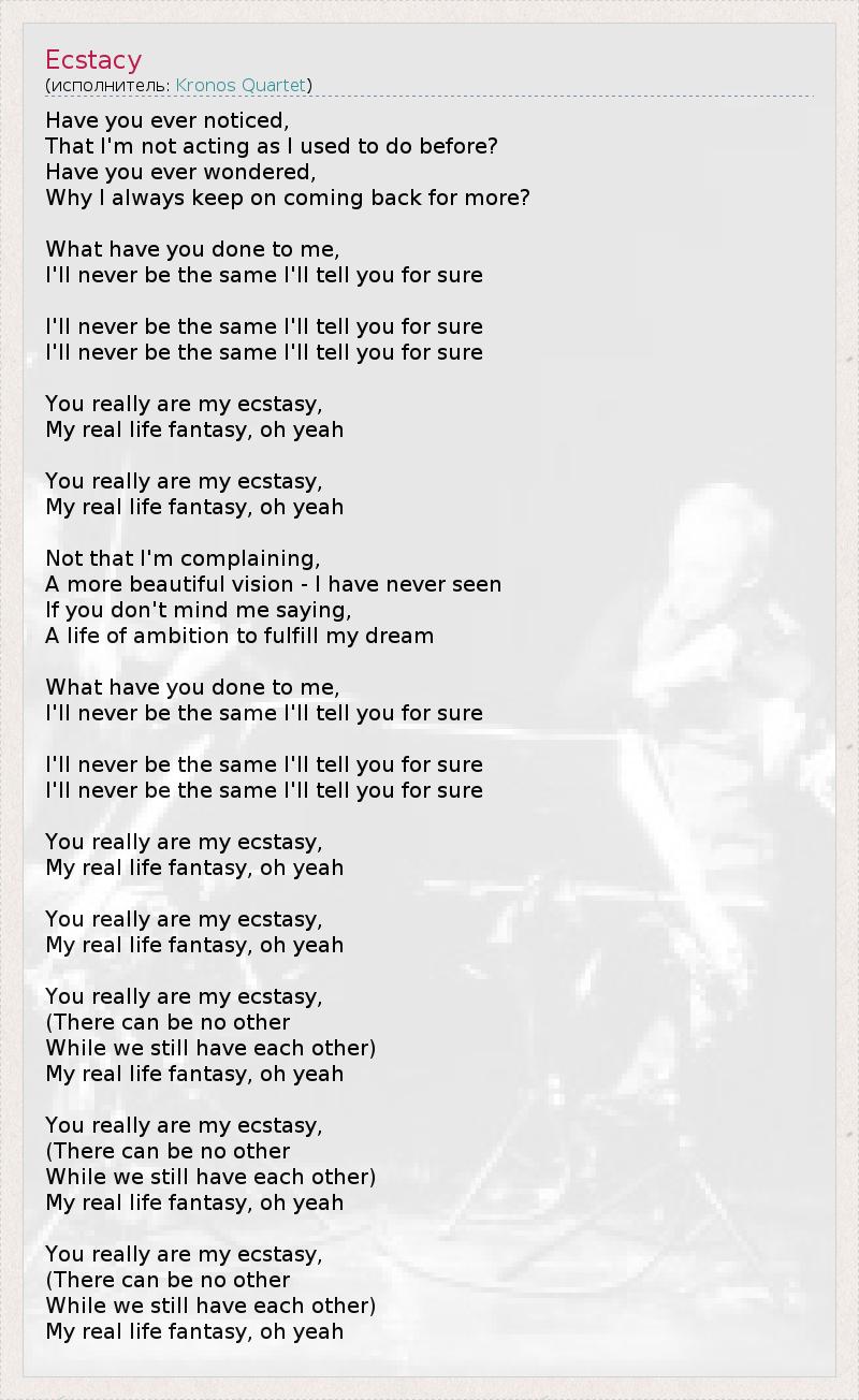 Ты когда-нибудь замечал? Что я веду себя не так, как вела раньше? Ты когда-нибудь интересовался, Почему я всегда продолжаю делать одно и тоже? Что ты сделал для меня? Я никогда не буду такой, как прежде, точно тебе говорю Я никогда не буду такой, как прежде, точно тебе говорю Я никогда не буду такой, как прежде, точно тебе говорю Ты - мой экстази Моя настоящая жизнь - это сказка Ты - мой экстази Моя настоящая жизнь - это сказка Не то, чтобы я жаловалась Я не видела ничего красивее. Если ты не против, я скажу, что, Цель жизни исполнила мои мечты Что ты сделал для меня? Я никогда не буду такой, как прежде, точно тебе говорю (x3) Ты - мой экстази. И никогда такого не будет Пока мы всё ещё есть друг у друга. Моя настоящая жизнь - это сказка И в ней не может быть никого другого Пока мы всё ещё вместе