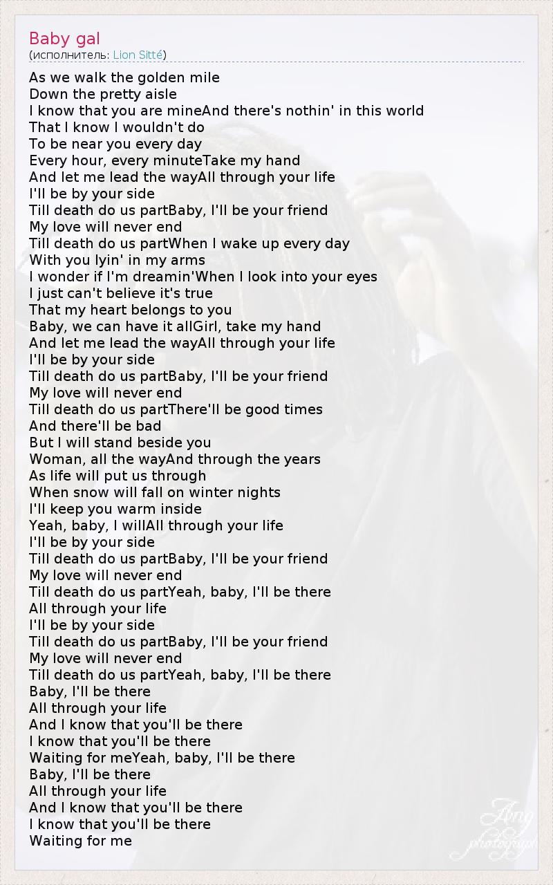 As we walk the golden mile Down the pretty aisle I know that you are mineAnd there's nothin' in this world That I know I wouldn't do To be near you every day Every hour, every minuteTake my hand And let me lead the wayAll through your life I'll be by your side Till death do us partBaby, I'll be your friend My love will never end Till death do us partWhen I wake up every day With you lyin' in my arms I wonder if I'm dreamin'When I look into your eyes I just can't believe it's true That my heart belongs to you Baby, we can have it allGirl, take my hand And let me lead the wayAll through your life I'll be by your side Till death do us partBaby, I'll be your friend My love will never end Till death do us partThere'll be good times And there'll be bad But I will stand beside you Woman, all the wayAnd through the years As life will put us through When snow will fall on winter nights I'll keep you warm inside Yeah, baby, I willAll through your life I'll be by your side Till death do us partBaby, I'll be your friend My love will never end Till death do us partYeah, baby, I'll be there All through your life I'll be by your side Till death do us partBaby, I'll be your friend My love will never end Till death do us partYeah, baby, I'll be there Baby, I'll be there All through your life And I know that you'll be there I know that you'll be there Waiting for meYeah, baby, I'll be there Baby, I'll be there All through your life And I know that you'll be there I know that you'll be there Waiting for me