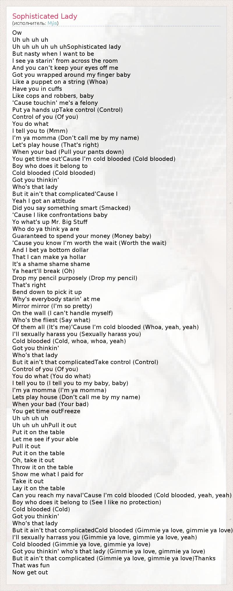 Ow Uh uh uh uh Uh uh uh uh uh uhSophisticated lady But nasty when I want to be I see ya starin' from across the room And you can't keep your eyes off me Got you wrapped around my finger baby Like a puppet on a string (Whoa) Have you in cuffs Like cops and robbers, baby 'Cause touchin' me's a felony Put ya hands upTake control (Control) Control of you (Of you) You do what I tell you to (Mmm) I'm ya momma (Don't call me by my name) Let's play house (That's right) When your bad (Pull your pants down) You get time out'Cause I'm cold blooded (Cold blooded) Boy who does it belong to Cold blooded (Cold blooded) Got you thinkin' Who's that lady But it ain't that complicated'Cause I Yeah I got an attitude Did you say something smart (Smacked) 'Cause I like confrontations baby Yo what's up Mr. Big Stuff Who do ya think ya are Guaranteed to spend your money (Money baby) 'Cause you know I'm worth the wait (Worth the wait) And I bet ya bottom dollar That I can make ya hollar It's a shame shame shame Ya heart'll break (Oh) Drop my pencil purposely (Drop my pencil) That's right Bend down to pick it up Why's everybody starin' at me Mirror mirror (I'm so pretty) On the wall (I can't handle myself) Who's the fliest (Say what) Of them all (It's me)'Cause I'm cold blooded (Whoa, yeah, yeah) I'll sexually harass you (Sexually harass you) Cold blooded (Cold, whoa, whoa, yeah) Got you thinkin' Who's that lady But it ain't that complicatedTake control (Control) Control of you (Of you) You do what (You do what) I tell you to (I tell you to my baby, baby) I'm ya momma (I'm ya momma) Lets play house (Don't call me by my name) When your bad (Your bad) You get time outFreeze Uh uh uh uh Uh uh uh uhPull it out Put it on the table Let me see if your able Pull it out Put it on the table Oh, take it out Throw it on the table Show me what I paid for Take it out Lay it on the table Can you reach my naval'Cause I'm cold blooded (Cold blooded, yeah, yeah) Boy who does it belong to (See I like no protection) Cold blooded (Cold) Got you thinkin' Who's that lady But it ain't that complicatedCold blooded (Gimmie ya love, gimmie ya love) I'll sexually harrass you (Gimmie ya love, gimmie ya love, yeah) Cold blooded (Gimmie ya love, gimmie ya love) Got you thinkin' who's that lady (Gimmie ya love, gimmie ya love) But it ain't that complicated (Gimmie ya love, gimmie ya love)Thanks That was fun Now get out