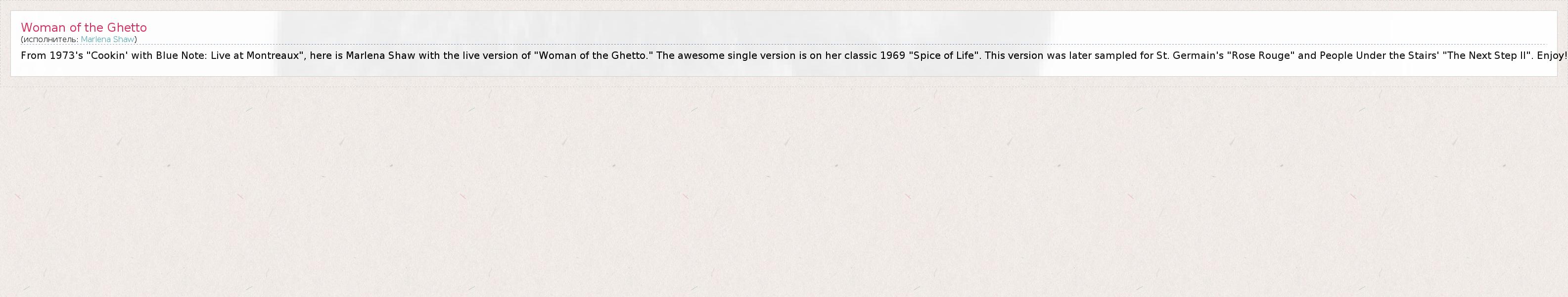 From 1973's "Cookin' with Blue Note: Live at Montreaux", here is Marlena Shaw with the live version of "Woman of the Ghetto." The awesome single version is on her classic 1969 "Spice of Life". This version was later sampled for St. Germain's "Rose Rouge" and People Under the Stairs' "The Next Step II". Enjoy!