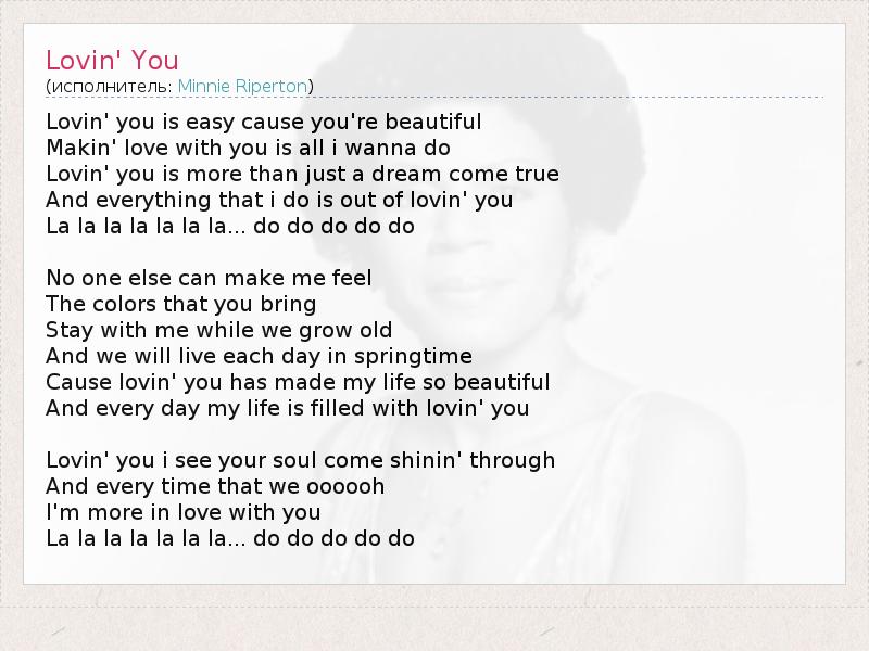 Lovin' you is easy cause you're beautiful Makin' love with you is all i wanna do Lovin' you is more than just a dream come true And everything that i do is out of lovin' you La la la la la la la... do do do do do No one else can make me feel The colors that you bring Stay with me while we grow old And we will live each day in springtime Cause lovin' you has made my life so beautiful And every day my life is filled with lovin' you Lovin' you i see your soul come shinin' through And every time that we oooooh I'm more in love with you La la la la la la la... do do do do do