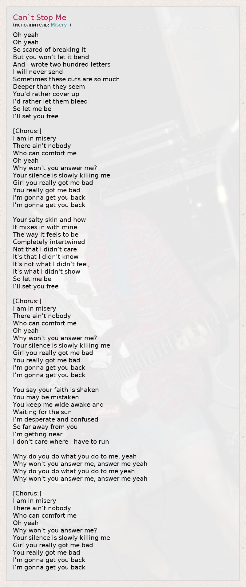 Oh yeah Oh yeah So scared of breaking it But you won't let it bend And I wrote two hundred letters I will never send Sometimes these cuts are so much Deeper than they seem You'd rather cover up I'd rather let them bleed So let me be I'll set you free [Chorus:] I am in misery There ain't nobody Who can comfort me Oh yeah Why won't you answer me? Your silence is slowly killing me Girl you really got me bad You really got me bad I'm gonna get you back I'm gonna get you back Your salty skin and how It mixes in with mine The way it feels to be Completely intertwined Not that I didn't care It's that I didn't know It's not what I didn't feel, It's what I didn't show So let me be I'll set you free [Chorus:] I am in misery There ain't nobody Who can comfort me Oh yeah Why won't you answer me? Your silence is slowly killing me Girl you really got me bad You really got me bad I'm gonna get you back I'm gonna get you back You say your faith is shaken You may be mistaken You keep me wide awake and Waiting for the sun I'm desperate and confused So far away from you I'm getting near I don't care where I have to run Why do you do what you do to me, yeah Why won't you answer me, answer me yeah Why do you do what you do to me yeah Why won't you answer me, answer me yeah [Chorus:] I am in misery There ain't nobody Who can comfort me Oh yeah Why won't you answer me? Your silence is slowly killing me Girl you really got me bad You really got me bad I'm gonna get you back I'm gonna get you back