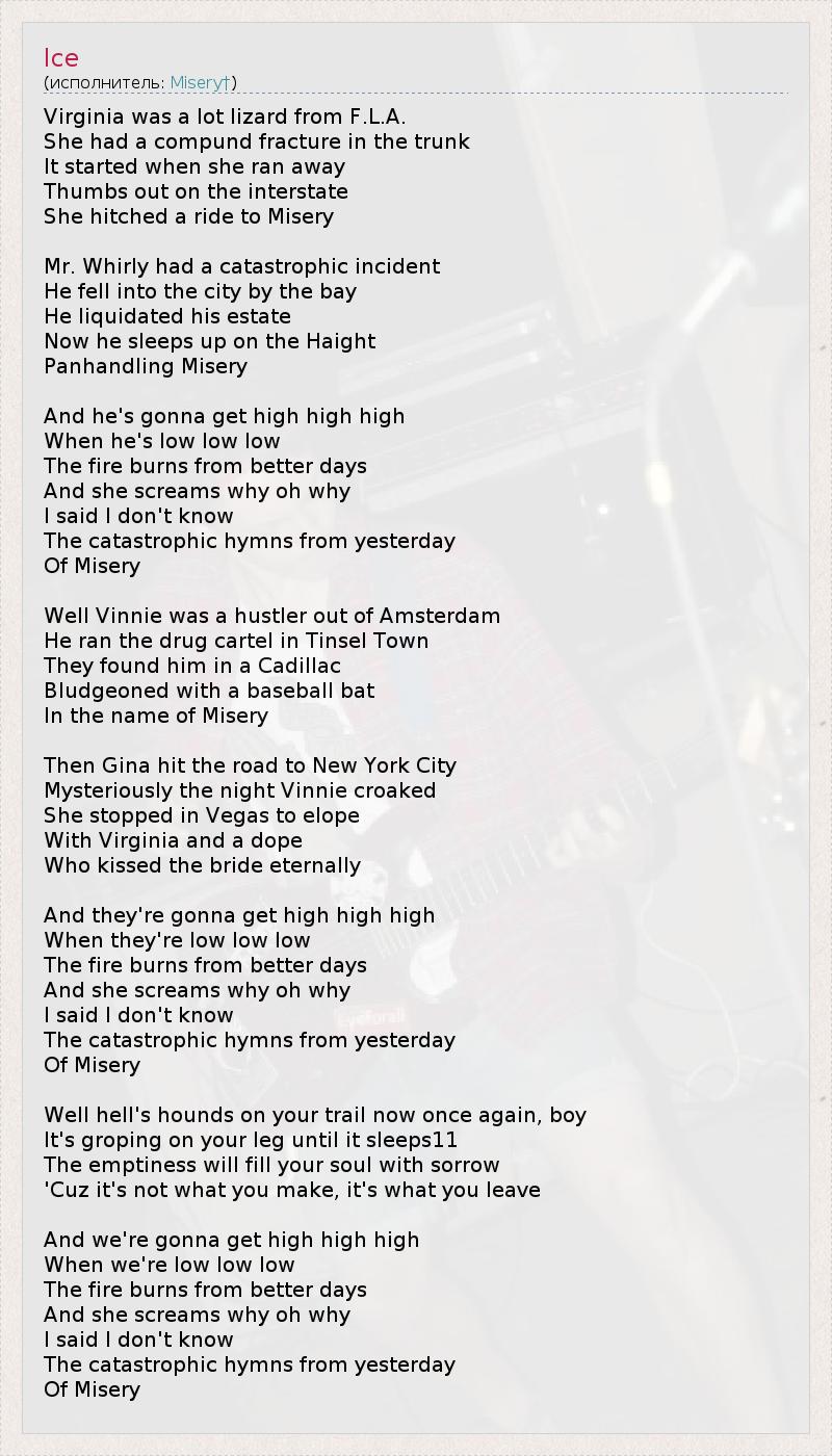 Это интересно:Post-metal/post-hardcore/experimentalГруппа Misery. Сама идея группы и материал существовали уже несколько лет, но состав начал формироваться только весной 2011 года. За это время выпустили одну дэмо запись и ЕР альбом. Сейчас идет работа над новым материалом и выпуском сингла. Играли на одной сцене с Dead harts (UK), The... продолжение