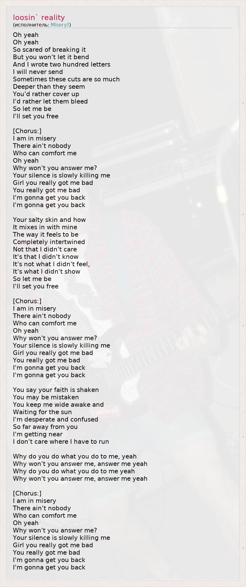 Oh yeah Oh yeah So scared of breaking it But you won't let it bend And I wrote two hundred letters I will never send Sometimes these cuts are so much Deeper than they seem You'd rather cover up I'd rather let them bleed So let me be I'll set you free [Chorus:] I am in misery There ain't nobody Who can comfort me Oh yeah Why won't you answer me? Your silence is slowly killing me Girl you really got me bad You really got me bad I'm gonna get you back I'm gonna get you back Your salty skin and how It mixes in with mine The way it feels to be Completely intertwined Not that I didn't care It's that I didn't know It's not what I didn't feel, It's what I didn't show So let me be I'll set you free [Chorus:] I am in misery There ain't nobody Who can comfort me Oh yeah Why won't you answer me? Your silence is slowly killing me Girl you really got me bad You really got me bad I'm gonna get you back I'm gonna get you back You say your faith is shaken You may be mistaken You keep me wide awake and Waiting for the sun I'm desperate and confused So far away from you I'm getting near I don't care where I have to run Why do you do what you do to me, yeah Why won't you answer me, answer me yeah Why do you do what you do to me yeah Why won't you answer me, answer me yeah [Chorus:] I am in misery There ain't nobody Who can comfort me Oh yeah Why won't you answer me? Your silence is slowly killing me Girl you really got me bad You really got me bad I'm gonna get you back I'm gonna get you back