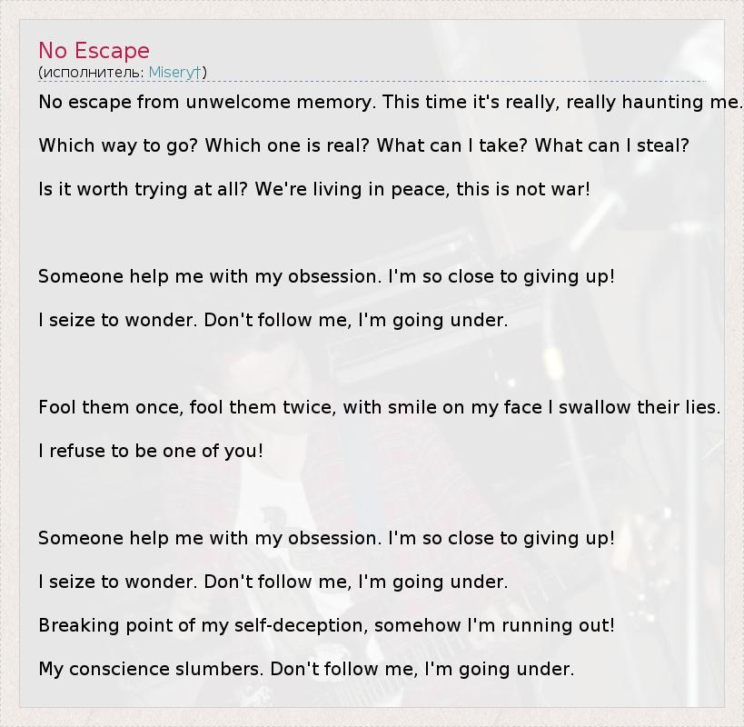 No escape from unwelcome memory. This time it's really, really haunting me. Which way to go? Which one is real? What can I take? What can I steal? Is it worth trying at all? We're living in peace, this is not war! Someone help me with my obsession. I'm so close to giving up! I seize to wonder. Don't follow me, I'm going under. Fool them once, fool them twice, with smile on my face I swallow their lies. I refuse to be one of you! Someone help me with my obsession. I'm so close to giving up! I seize to wonder. Don't follow me, I'm going under. Breaking point of my self-deception, somehow I'm running out! My conscience slumbers. Don't follow me, I'm going under.