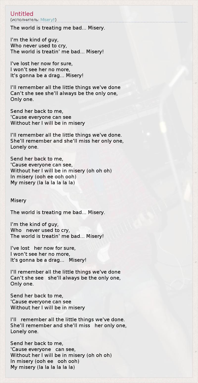The world is treating me bad... Misery. I'm the kind of guy, Who never used to cry, The world is treatin' me bad... Misery! I've lost her now for sure, I won't see her no more, It's gonna be a drag... Misery! I'll remember all the little things we've done Can't she see she'll always be the only one, Only one. Send her back to me, 'Cause everyone can see Without her I will be in misery I'll remember all the little things we've done. She'll remember and she'll miss her only one, Lonely one. Send her back to me, 'Cause everyone can see, Without her I will be in misery (oh oh oh) In misery (ooh ee ooh ooh) My misery (la la la la la la) Misery The world is treating me bad... Misery. I'm the kind of guy, Who never used to cry, The world is treatin' me bad... Misery! I've lost her now for sure, I won't see her no more, It's gonna be a drag... Misery! I'll remember all the little things we've done Can't she see she'll always be the only one, Only one. Send her back to me, 'Cause everyone can see Without her I will be in misery I'll remember all the little things we've done. She'll remember and she'll miss her only one, Lonely one. Send her back to me, 'Cause everyone can see, Without her I will be in misery (oh oh oh) In misery (ooh ee ooh ooh) My misery (la la la la la la)