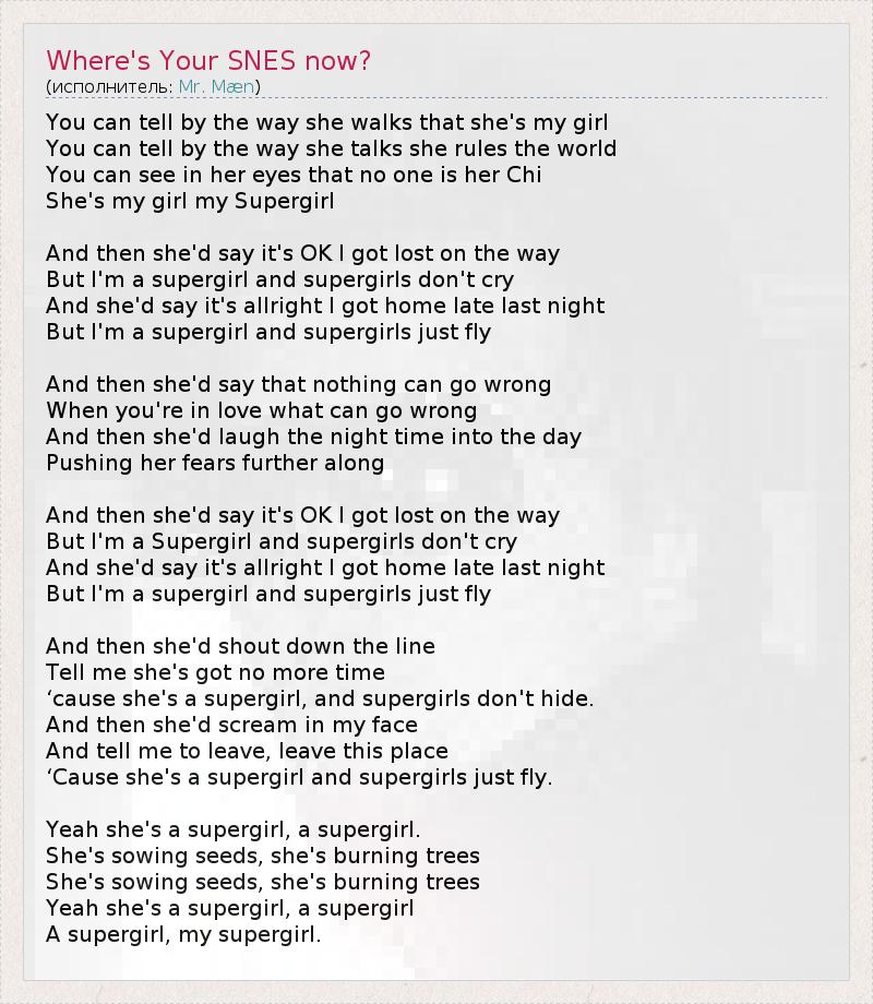 По её походке можно сказать, что она моя девушка По тому, как она говорит, можно сказать, что она правит миром В её глазах можно прочесть, что нет того, кем бы она дышала. 1 Она моя девушка, супердевушка. И тогда она скажет: "Всё хорошо, я сбилась с пути, Но я супердевушка, а супердевушки не плачут". И тогда она скажет: "Всё хорошо, вчера я поздно пришла домой. Но я супердевушка, а супердевушки просто летают". И тогда она скажет, что ничто не может пойти не так. Когда ты влюблен, что может быть не так? И тогда она будет смеяться всю ночь, до утра, Прогоняя свои страхи прочь. И тогда она скажет: "Всё хорошо, я сбилась с пути, Но я супердевушка, а супердевушки не плачут". И тогда она скажет: "Всё хорошо, вчера я пришла домой поздно ночью. Но я супердевушка, а супердевушки просто летают". И тогда она будет кричать И говорить мне, что у неё больше нет времени, Потому что она супердевушка, а супердевушки не прячутся. И тогда она будет кричать мне в лицо И говорить мне, чтобы я ушёл, покинул это место, Потому что она супердевушка, а супердевушки просто летают. Да, она супердевушка, супердевушка. Она сажает семена, она сжигает деревья, Она сажает семена, она сжигает деревья. Да, она супердевушка, супердевушка, Супердевушка, моя супердевушка. 1 - ци (в китайской философии) - "пневма", "эфир", "воздух", "дыхание", "энергия", "жизненная сила". Альтернативный вариант перевода - "она ни в ком не черпает энергию", "никто не является для неё источником живительной силы"