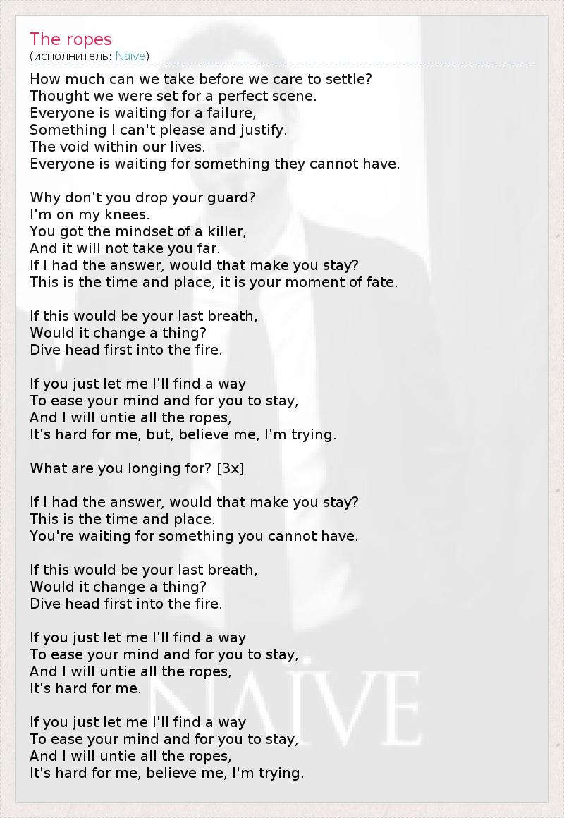 How much can we take before we care to settle? Thought we were set for a perfect scene. Everyone is waiting for a failure, Something I can't please and justify. The void within our lives. Everyone is waiting for something they cannot have. Why don't you drop your guard? I'm on my knees. You got the mindset of a killer, And it will not take you far. If I had the answer, would that make you stay? This is the time and place, it is your moment of fate. If this would be your last breath, Would it change a thing? Dive head first into the fire. If you just let me I'll find a way To ease your mind and for you to stay, And I will untie all the ropes, It's hard for me, but, believe me, I'm trying. What are you longing for? [3x] If I had the answer, would that make you stay? This is the time and place. You're waiting for something you cannot have. If this would be your last breath, Would it change a thing? Dive head first into the fire. If you just let me I'll find a way To ease your mind and for you to stay, And I will untie all the ropes, It's hard for me. If you just let me I'll find a way To ease your mind and for you to stay, And I will untie all the ropes, It's hard for me, believe me, I'm trying.
