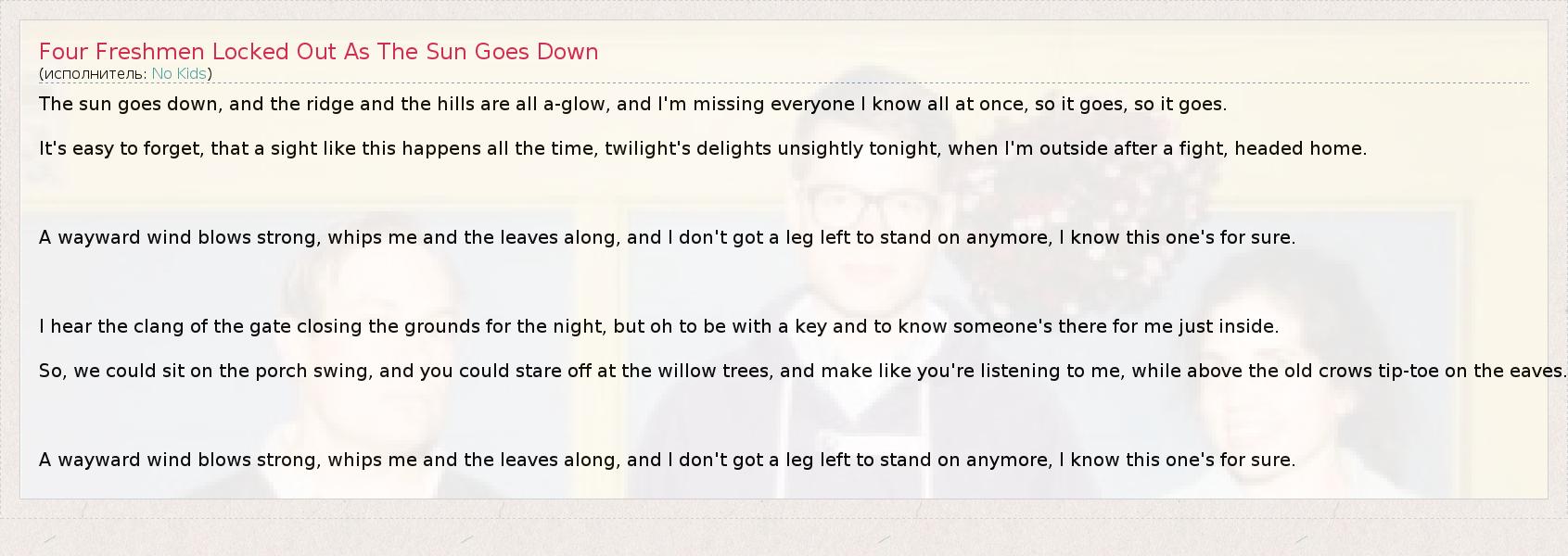 ГлавнаяИсполнителиNo KidsFour Freshmen Locked Out As The Sun Goes Down