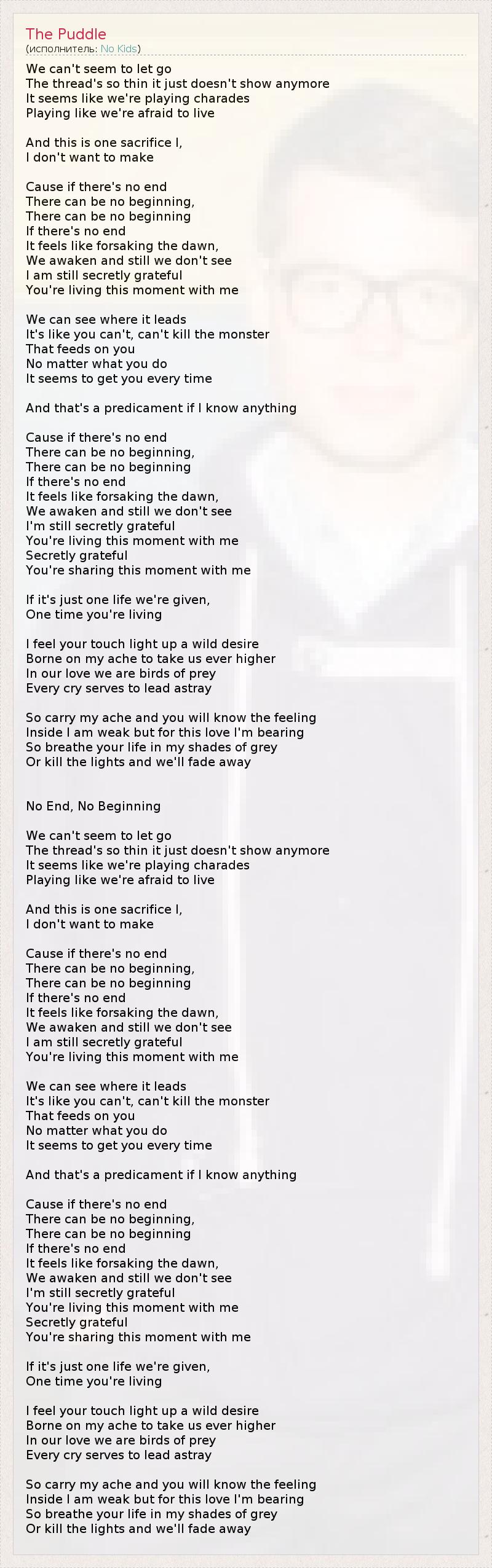 Кажется, мы не можем отпустить Ту тонкую нить, которая уже ничего не связывает. Кажется, что мы играем в тайны, Играя, словно боимся жить. И если это единственная жертва, То я не хочу жертвовать ею. Ибо если нет конца, Значит, не может быть и начала, Не может быть и начала. Если нет конца. Такое чувство, что мы отрекаемся от рассвета: Мы просыпаемся, но всё равно не видим его... Я не перестаю украдкой благодарить тебя за то, Что ты проживаешь этот момент со мной. Мы знаем, к чему ведёт этот путь, Будто ты не в силах, не в силах убить этого монстра, Пожирающего тебя. И не важно, что ты предпринимаешь, Он всё равно каждый раз хватает тебя. И если я узнаю что-либо об этом, мне будет тяжело. Ибо если нет конца, Значит, не может быть и начала, Не может быть и начала. Если нет конца, Такое чувство, что мы отрекаемся от рассвета: Мы просыпаемся, но всё равно не видим его... Я не перестаю украдкой благодарить тебя за то, Что ты проживаешь этот момент со мной. Я украдкой благодарю тебя за то, Что ты разделяешь этот момент со мной. Если нам однажды дана жизнь, Значит, прожить её нужно достойно. Я чувствую, как твоё прикосновение разжигает во мне дикое желание, Усиливая мою боль, чтобы вознести нас к небесам. В нашей любви мы - хищные птицы, И каждый их крик сбивает нас с пути. Так неси же мою боль, и ты разгадаешь чувство, В глубине которого я слаб, но ради этой любви я вынесу всё. Так впусти свою жизнь в мои оттенки серого Или погаси огни и мы исчезнем. Нет конца, нет начала (перевод Мария Василек из Москвы) Нет, нам не отпустить Ту нить, что не поможет связать ничего. Будто мы заигрались с тобой, А теперь побоялись жить. И жертву одну эту я, Я не принесу. Там, где нет конца, Там не быть и началу, Там не быть и началу. Где нет конца, Даём от рассвета отказ, Просыпаясь, не видим его. Но спасибо тебе, Что сей миг проживаешь со мной. Знаем мы, что грядёт, Будто ты, не повергнешь ты монстра, Что тебя бьёт. И не сделать ничего, Тебе не скрыться от него. И будет мне тяжело теперь это узнать. Ведь где нет конца, Там не быть и началу, Там не быть и началу. Где нет конца, Даём от рассвета отказ, Просыпаясь, не видим его. Но спасибо тебе, Что сей миг проживаешь со мной. Спасибо тебе, Что сей миг разделяешь со мной. И если нам дана одна жизнь, Так за раз её проживи. Прикосновение твоё желанно, Рождает боль, что вознесёт нежданно. Но в любви мы лишь ястребы, Каждый крик сбивает с пути. Укрой мою боль, и чувство ты познаешь. Я слаб изнутри, но за любовь сражаюсь. Вдохни жизнь свою в серость дней, Или погаси.. свет огней.