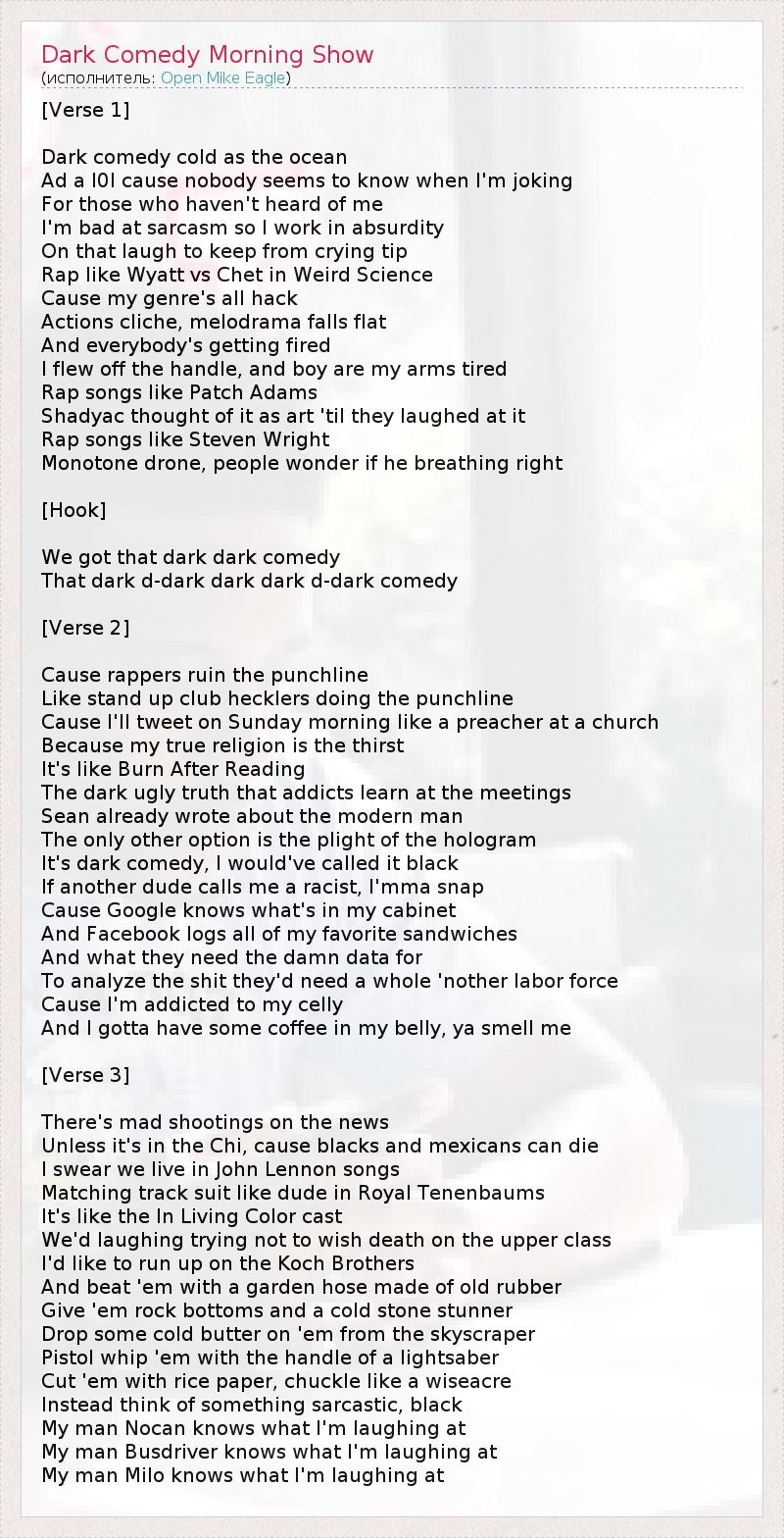 [Verse 1] Dark comedy cold as the ocean Ad a l0l cause nobody seems to know when I'm joking For those who haven't heard of me I'm bad at sarcasm so I work in absurdity On that laugh to keep from crying tip Rap like Wyatt vs Chet in Weird Science Cause my genre's all hack Actions cliche, melodrama falls flat And everybody's getting fired I flew off the handle, and boy are my arms tired Rap songs like Patch Adams Shadyac thought of it as art 'til they laughed at it Rap songs like Steven Wright Monotone drone, people wonder if he breathing right [Hook] We got that dark dark comedy That dark d-dark dark dark d-dark comedy [Verse 2] Cause rappers ruin the punchline Like stand up club hecklers doing the punchline Cause I'll tweet on Sunday morning like a preacher at a church Because my true religion is the thirst It's like Burn After Reading The dark ugly truth that addicts learn at the meetings Sean already wrote about the modern man The only other option is the plight of the hologram It's dark comedy, I would've called it black If another dude calls me a racist, I'mma snap Cause Google knows what's in my cabinet And Facebook logs all of my favorite sandwiches And what they need the damn data for To analyze the shit they'd need a whole 'nother labor force Cause I'm addicted to my celly And I gotta have some coffee in my belly, ya smell me [Verse 3] There's mad shootings on the news Unless it's in the Chi, cause blacks and mexicans can die I swear we live in John Lennon songs Matching track suit like dude in Royal Tenenbaums It's like the In Living Color cast We'd laughing trying not to wish death on the upper class I'd like to run up on the Koch Brothers And beat 'em with a garden hose made of old rubber Give 'em rock bottoms and a cold stone stunner Drop some cold butter on 'em from the skyscraper Pistol whip 'em with the handle of a lightsaber Cut 'em with rice paper, chuckle like a wiseacre Instead think of something sarcastic, black My man Nocan knows what I'm laughing at My man Busdriver knows what I'm laughing at My man Milo knows what I'm laughing at