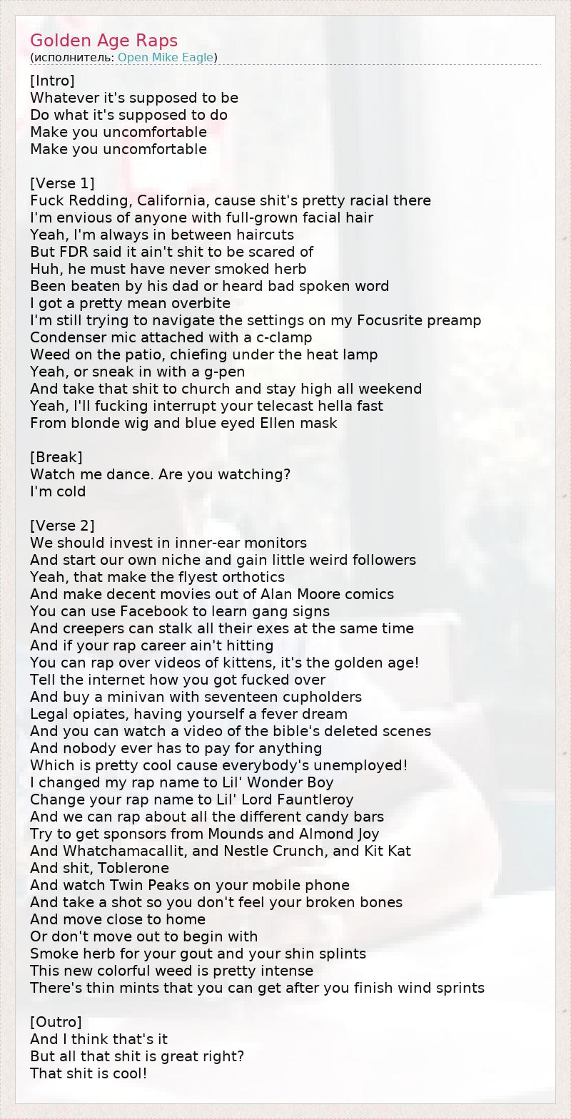 [Intro] Whatever it's supposed to be Do what it's supposed to do Make you uncomfortable Make you uncomfortable [Verse 1] Fuck Redding, California, cause shit's pretty racial there I'm envious of anyone with full-grown facial hair Yeah, I'm always in between haircuts But FDR said it ain't shit to be scared of Huh, he must have never smoked herb Been beaten by his dad or heard bad spoken word I got a pretty mean overbite I'm still trying to navigate the settings on my Focusrite preamp Condenser mic attached with a c-clamp Weed on the patio, chiefing under the heat lamp Yeah, or sneak in with a g-pen And take that shit to church and stay high all weekend Yeah, I'll fucking interrupt your telecast hella fast From blonde wig and blue eyed Ellen mask [Break] Watch me dance. Are you watching? I'm cold [Verse 2] We should invest in inner-ear monitors And start our own niche and gain little weird followers Yeah, that make the flyest orthotics And make decent movies out of Alan Moore comics You can use Facebook to learn gang signs And creepers can stalk all their exes at the same time And if your rap career ain't hitting You can rap over videos of kittens, it's the golden age! Tell the internet how you got fucked over And buy a minivan with seventeen cupholders Legal opiates, having yourself a fever dream And you can watch a video of the bible's deleted scenes And nobody ever has to pay for anything Which is pretty cool cause everybody's unemployed! I changed my rap name to Lil' Wonder Boy Change your rap name to Lil' Lord Fauntleroy And we can rap about all the different candy bars Try to get sponsors from Mounds and Almond Joy And Whatchamacallit, and Nestle Crunch, and Kit Kat And shit, Toblerone And watch Twin Peaks on your mobile phone And take a shot so you don't feel your broken bones And move close to home Or don't move out to begin with Smoke herb for your gout and your shin splints This new colorful weed is pretty intense There's thin mints that you can get after you finish wind sprints [Outro] And I think that's it But all that shit is great right? That shit is cool!