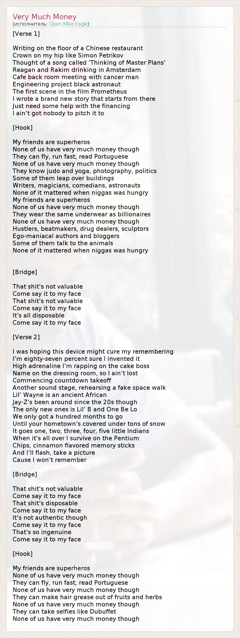 А как ты думаешь, о чем песня "Very Much Money" ?