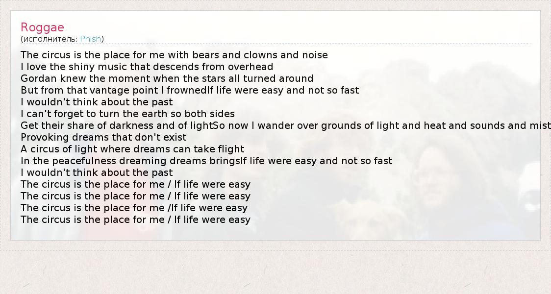 Это интересно:Phish — американская рок-группа, примечательная своими джем-сейшнами, импровизациями и постмодернистским смешением жанров. Phish была образована в 1983 году в университете Вермонта. Четыре ее участника выступали вместе 21 год, пока не распались в августе 2004 года. Их музыка содержала в себе элементы широкoго спектра жанров, и каждый их концерт был оригинальным в плане исполнения песен, порядка... продолжение