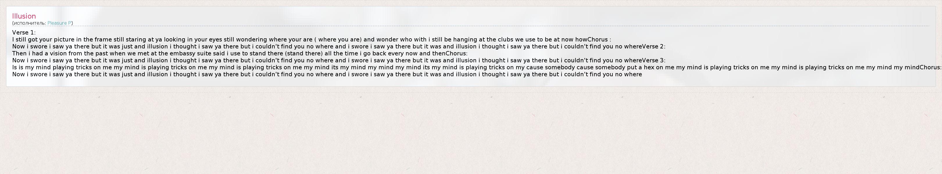 Now i swore i saw ya there but it was just and illusion i thought i saw ya there but i couldn't find you no where and i swore i saw ya there but it was and illusion i thought i saw ya there but i couldn't find you no whereVerse 2: