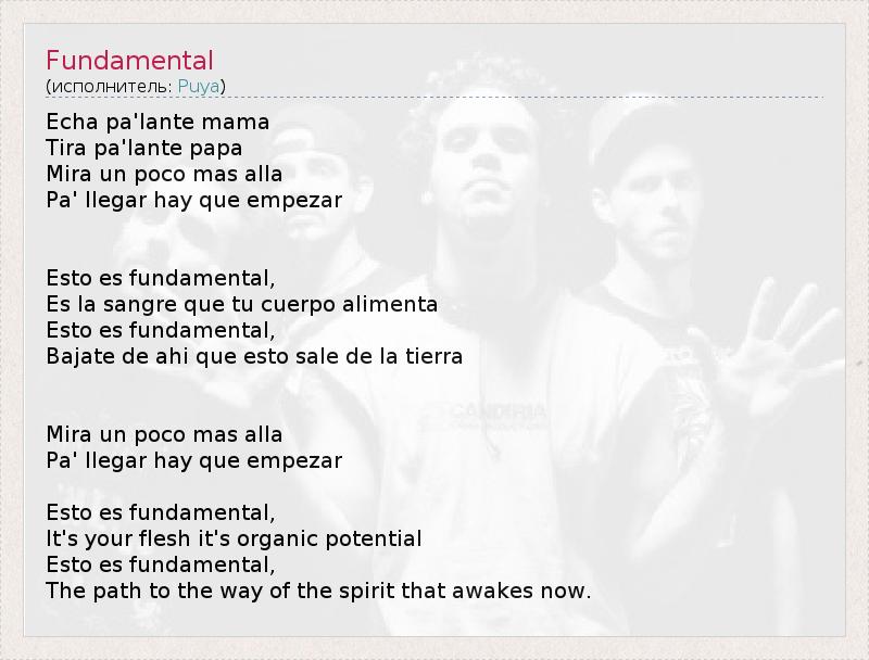 Echa pa'lante mama Tira pa'lante papa Mira un poco mas alla Pa' llegar hay que empezar Esto es fundamental, Es la sangre que tu cuerpo alimenta Esto es fundamental, Bajate de ahi que esto sale de la tierra Mira un poco mas alla Pa' llegar hay que empezar Esto es fundamental, It's your flesh it's organic potential Esto es fundamental, The path to the way of the spirit that awakes now.