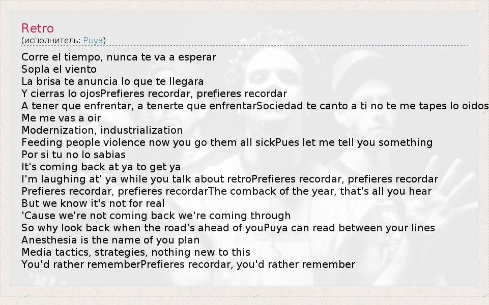 Corre el tiempo, nunca te va a esperar Sopla el viento La brisa te anuncia lo que te llegara Y cierras lo ojosPrefieres recordar, prefieres recordar A tener que enfrentar, a tenerte que enfrentarSociedad te canto a ti no te me tapes lo oidos Me me vas a oir Modernization, industrialization Feeding people violence now you go them all sickPues let me tell you something Por si tu no lo sabias It's coming back at ya to get ya I'm laughing at' ya while you talk about retroPrefieres recordar, prefieres recordar Prefieres recordar, prefieres recordarThe comback of the year, that's all you hear But we know it's not for real 'Cause we're not coming back we're coming through So why look back when the road's ahead of youPuya can read between your lines Anesthesia is the name of you plan Media tactics, strategies, nothing new to this You'd rather rememberPrefieres recordar, you'd rather remember