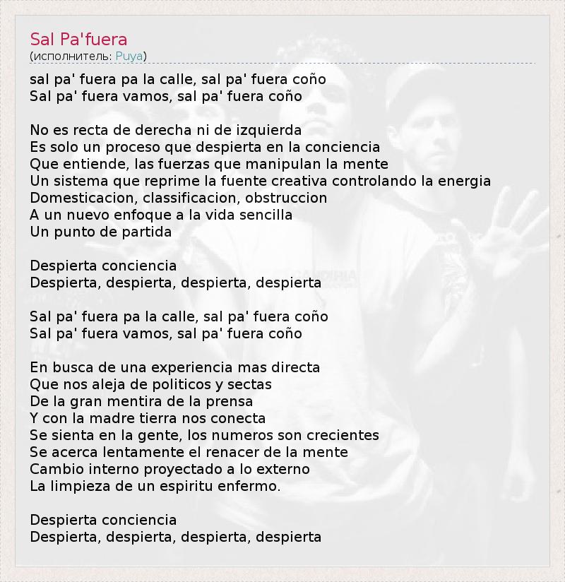 sal pa' fuera pa la calle, sal pa' fuera coño Sal pa' fuera vamos, sal pa' fuera coño No es recta de derecha ni de izquierda Es solo un proceso que despierta en la conciencia Que entiende, las fuerzas que manipulan la mente Un sistema que reprime la fuente creativa controlando la energia Domesticacion, classificacion, obstruccion A un nuevo enfoque a la vida sencilla Un punto de partida Despierta conciencia Despierta, despierta, despierta, despierta Sal pa' fuera pa la calle, sal pa' fuera coño Sal pa' fuera vamos, sal pa' fuera coño En busca de una experiencia mas directa Que nos aleja de politicos y sectas De la gran mentira de la prensa Y con la madre tierra nos conecta Se sienta en la gente, los numeros son crecientes Se acerca lentamente el renacer de la mente Cambio interno proyectado a lo externo La limpieza de un espiritu enfermo. Despierta conciencia Despierta, despierta, despierta, despierta