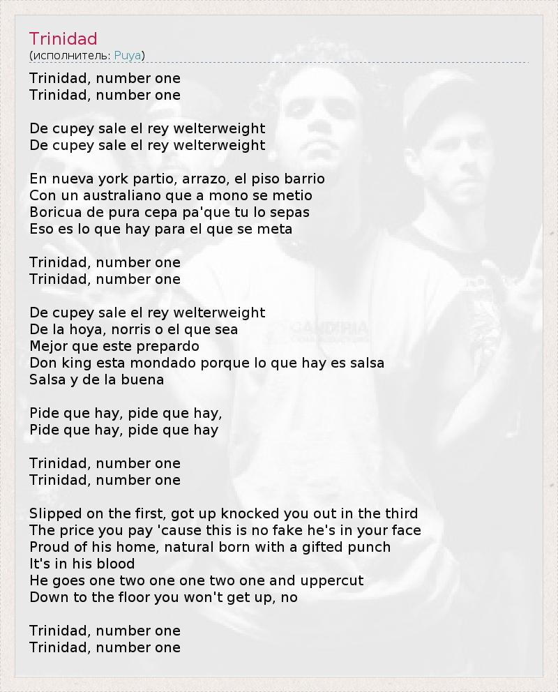 Trinidad, number one Trinidad, number one De cupey sale el rey welterweight De cupey sale el rey welterweight En nueva york partio, arrazo, el piso barrio Con un australiano que a mono se metio Boricua de pura cepa pa'que tu lo sepas Eso es lo que hay para el que se meta Trinidad, number one Trinidad, number one De cupey sale el rey welterweight De la hoya, norris o el que sea Mejor que este prepardo Don king esta mondado porque lo que hay es salsa Salsa y de la buena Pide que hay, pide que hay, Pide que hay, pide que hay Trinidad, number one Trinidad, number one Slipped on the first, got up knocked you out in the third The price you pay 'cause this is no fake he's in your face Proud of his home, natural born with a gifted punch It's in his blood He goes one two one one two one and uppercut Down to the floor you won't get up, no Trinidad, number one Trinidad, number one