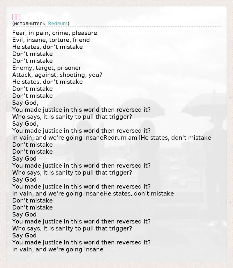 Fear, in pain, crime, pleasure Evil, insane, torture, friend He states, don't mistake Don't mistake Don't mistake Enemy, target, prisoner Attack, against, shooting, you? He states, don't mistake Don't mistake Don't mistake Say God, You made justice in this world then reversed it? Who says, it is sanity to pull that trigger? Say God, You made justice in this world then reversed it? In vain, and we're going insaneRedrum am IHe states, don't mistake Don't mistake Don't mistake Say God You made justice in this world then reversed it? Who says, it is sanity to pull that trigger? Say God You made justice in this world then reversed it? In vain, and we're going insaneHe states, don't mistake Don't mistake Don't mistake Say God You made justice in this world then reversed it? Who says, it is sanity to pull that trigger? Say God You made justice in this world then reversed it? In vain, and we're going insane