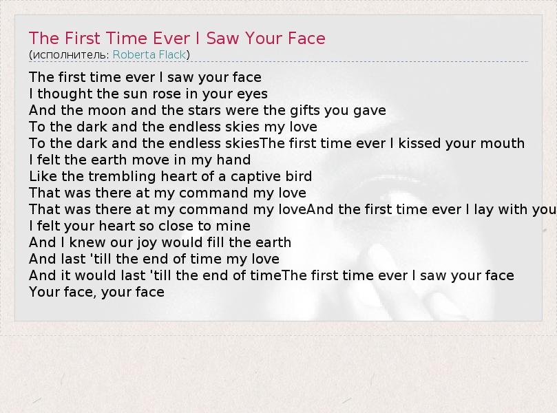 Это интересно:Роберта Флэк (англ. Roberta Flack, род. 10 февраля 1937 г.) — американская певица, автор песен. Неоднократная обладательница премии Грэмми. Известна исполнением утончённых джазовых баллад «The First Time Ever I Saw Your Face» (1972), «Killing Me Softly With His Song» (1973) и «Feel Like Makin' Love» (1974). Успех пришёл к Флэк в 1972 году, когда Клинт Иствуд использовал ее песню «The First Time Ever I Saw Your Face» в своем первом фильме «Сыграй мне «Туманно»».... продолжение