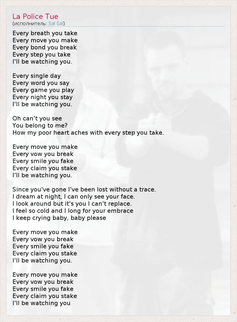Every breath you take Every move you make Every bond you break Every step you take I'll be watching you. Every single day Every word you say Every game you play Every night you stay I'll be watching you. Oh can't you see You belong to me? How my poor heart aches with every step you take. Every move you make Every vow you break Every smile you fake Every claim you stake I'll be watching you. Since you've gone I've been lost without a trace. I dream at night, I can only see your face. I look around but it's you I can't replace. I feel so cold and I long for your embrace I keep crying baby, baby please Every move you make Every vow you break Every smile you fake Every claim you stake I'll be watching you. Every move you make Every vow you break Every smile you fake Every claim you stake I'll be watching you