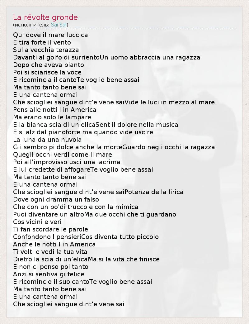 Qui dove il mare luccica E tira forte il vento Sulla vecchia terazza Davanti al golfo di surrientoUn uomo abbraccia una ragazza Dopo che aveva pianto Poi si sciarisce la voce E ricomincia il cantoTe voglio bene assai Ma tanto tanto bene sai E una cantena ormai Che sciogliei sangue dint'e vene saiVide le luci in mezzo al mare Pens alle notti l in America Ma erano solo le lampare E la bianca scia di un'elicaSent il dolore nella musica E si alz dal pianoforte ma quando vide uscire La luna da una nuvola Gli sembro pi dolce anche la morteGuardo negli occhi la ragazza Quegli occhi verdi come il mare Poi all'improvisso usci una lacrima E lui credette di affogareTe voglio bene assai Ma tanto tanto bene sai E una cantena ormai Che sciogliei sangue dint'e vene saiPotenza della lirica Dove ogni dramma un falso Che con un po'di trucco e con la mimica Puoi diventare un altroMa due occhi che ti guardano Cos vicini e veri Ti fan scordare le parole Confondono I pensieriCos diventa tutto piccolo Anche le notti l in America Ti volti e vedi la tua vita Dietro la scia di un'elicaMa si la vita che finisce E non ci penso poi tanto Anzi si sentiva gi felice E ricomincio il suo cantoTe voglio bene assai Ma tanto tanto bene sai E una cantena ormai Che sciogliei sangue dint'e vene sai