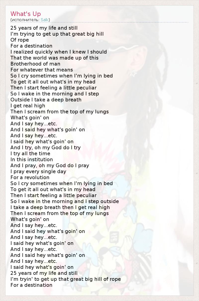 25 years of my life and still I'm trying to get up that great big hill Of rope For a destination I realized quickly when I knew I should That the world was made up of this Brotherhood of man For whatever that means So I cry sometimes when I'm lying in bed To get it all out what's in my head Then I start feeling a little peculiar So I wake in the morning and I step Outside I take a deep breath I get real high Then I scream from the top of my lungs What's goin' on And I say hey...etc. And I said hey what's goin' on And I say hey...etc. I said hey what's goin' on And I try, oh my God do I try I try all the time In this institution And I pray, oh my God do I pray I pray every single day For a revolution So I cry sometimes when I'm lying in bed To get it all out what's in my head Then I start feeling a little peculiar So I wake in the morning and I step outside I take a deep breath then I get real high Then I scream from the top of my lungs What's goin' on And I say hey...etc. And I said hey what's goin' on And I say hey...etc. I said hey what's goin' on And I say hey...etc. And I said hey what's goin' on And I say hey...etc. I said hey what's goin' on 25 years of my life and still I'm tryin' to get up that great big hill of rope For a destination