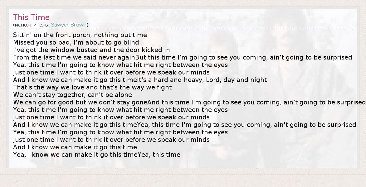And I know we can make it go this timeYea, this time I'm going to see you coming, ain't going to be surprised