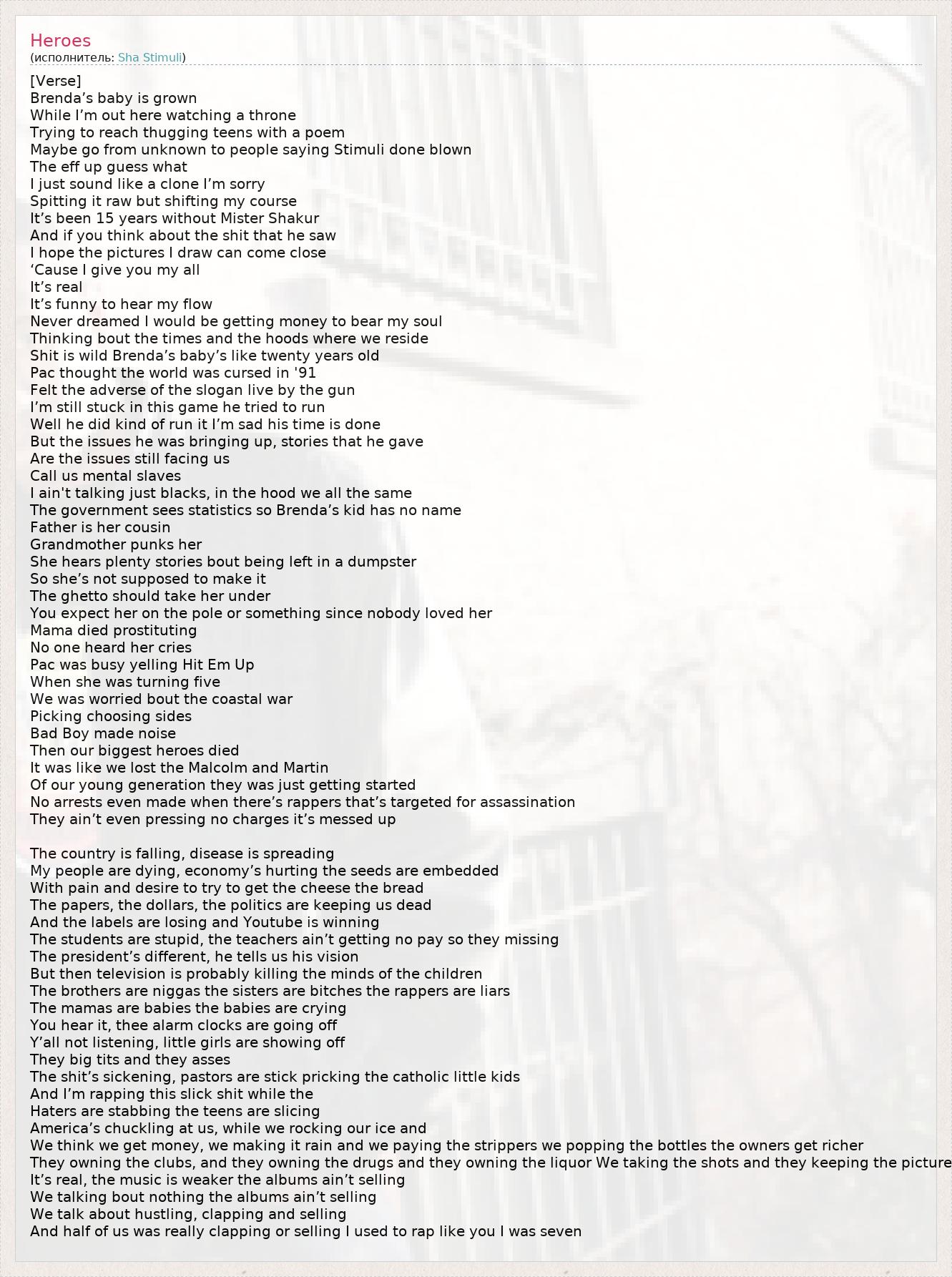 Thinking bout the times and the hoods where we reside