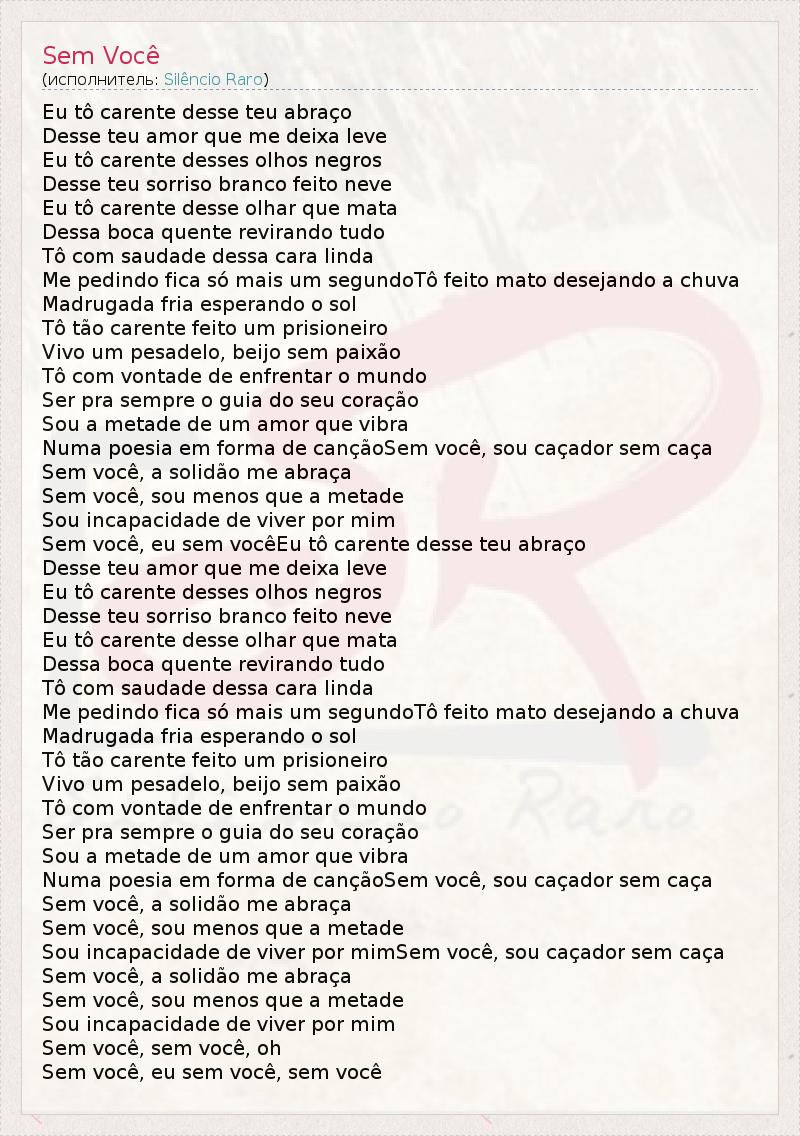 Eu tô carente desse teu abraço Desse teu amor que me deixa leve Eu tô carente desses olhos negros Desse teu sorriso branco feito neve Eu tô carente desse olhar que mata Dessa boca quente revirando tudo Tô com saudade dessa cara linda Me pedindo fica só mais um segundoTô feito mato desejando a chuva Madrugada fria esperando o sol Tô tão carente feito um prisioneiro Vivo um pesadelo, beijo sem paixão Tô com vontade de enfrentar o mundo Ser pra sempre o guia do seu coração Sou a metade de um amor que vibra Numa poesia em forma de cançãoSem você, sou caçador sem caça Sem você, a solidão me abraça Sem você, sou menos que a metade Sou incapacidade de viver por mim Sem você, eu sem vocêEu tô carente desse teu abraço Desse teu amor que me deixa leve Eu tô carente desses olhos negros Desse teu sorriso branco feito neve Eu tô carente desse olhar que mata Dessa boca quente revirando tudo Tô com saudade dessa cara linda Me pedindo fica só mais um segundoTô feito mato desejando a chuva Madrugada fria esperando o sol Tô tão carente feito um prisioneiro Vivo um pesadelo, beijo sem paixão Tô com vontade de enfrentar o mundo Ser pra sempre o guia do seu coração Sou a metade de um amor que vibra Numa poesia em forma de cançãoSem você, sou caçador sem caça Sem você, a solidão me abraça Sem você, sou menos que a metade Sou incapacidade de viver por mimSem você, sou caçador sem caça Sem você, a solidão me abraça Sem você, sou menos que a metade Sou incapacidade de viver por mim Sem você, sem você, oh Sem você, eu sem você, sem você