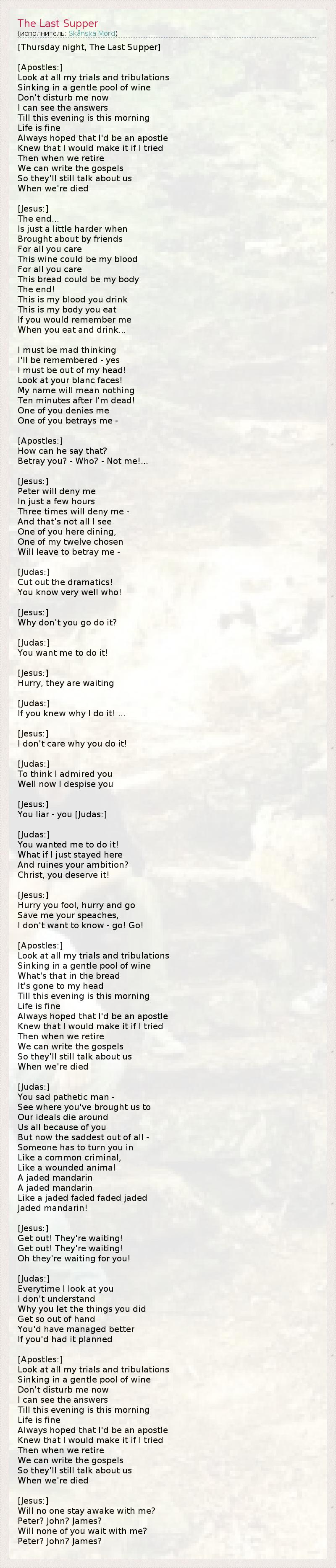 А как ты думаешь, о чем песня "The Last Supper" ?