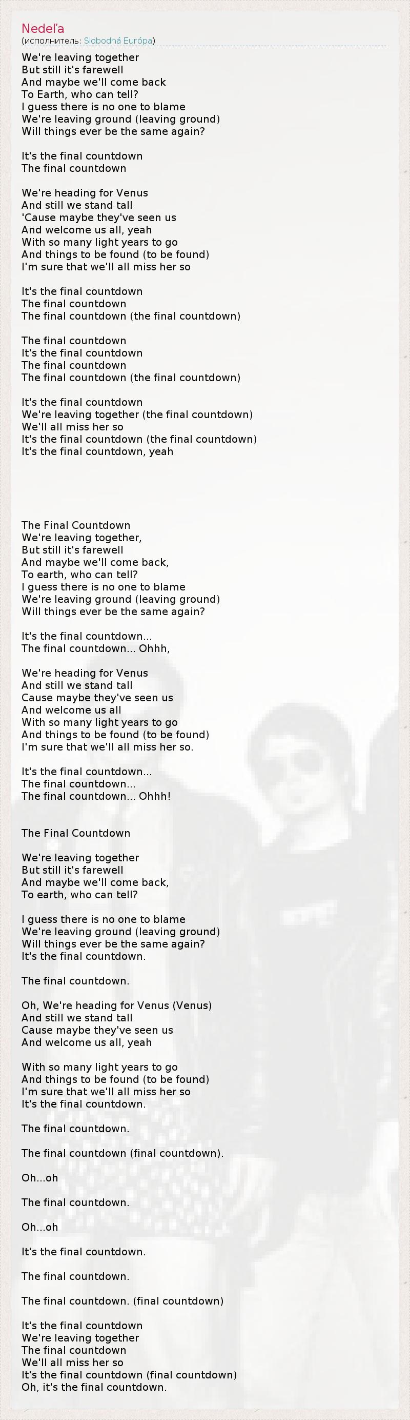 We're leaving together But still it's farewell And maybe we'll come back To Earth, who can tell? I guess there is no one to blame We're leaving ground (leaving ground) Will things ever be the same again? It's the final countdown The final countdown We're heading for Venus And still we stand tall 'Cause maybe they've seen us And welcome us all, yeah With so many light years to go And things to be found (to be found) I'm sure that we'll all miss her so It's the final countdown The final countdown The final countdown (the final countdown) The final countdown It's the final countdown The final countdown The final countdown (the final countdown) It's the final countdown We're leaving together (the final countdown) We'll all miss her so It's the final countdown (the final countdown) It's the final countdown, yeah The Final Countdown We're leaving together, But still it's farewell And maybe we'll come back, To earth, who can tell? I guess there is no one to blame We're leaving ground (leaving ground) Will things ever be the same again? It's the final countdown... The final countdown... Ohhh, We're heading for Venus And still we stand tall Cause maybe they've seen us And welcome us all With so many light years to go And things to be found (to be found) I'm sure that we'll all miss her so. It's the final countdown... The final countdown... The final countdown... Ohhh! The Final Countdown We're leaving together But still it's farewell And maybe we'll come back, To earth, who can tell? I guess there is no one to blame We're leaving ground (leaving ground) Will things ever be the same again? It's the final countdown. The final countdown. Oh, We're heading for Venus (Venus) And still we stand tall Cause maybe they've seen us And welcome us all, yeah With so many light years to go And things to be found (to be found) I'm sure that we'll all miss her so It's the final countdown. The final countdown. The final countdown (final countdown). Oh...oh The final countdown. Oh...oh It's the final countdown. The final countdown. The final countdown. (final countdown) It's the final countdown We're leaving together The final countdown We'll all miss her so It's the final countdown (final countdown) Oh, it's the final countdown.