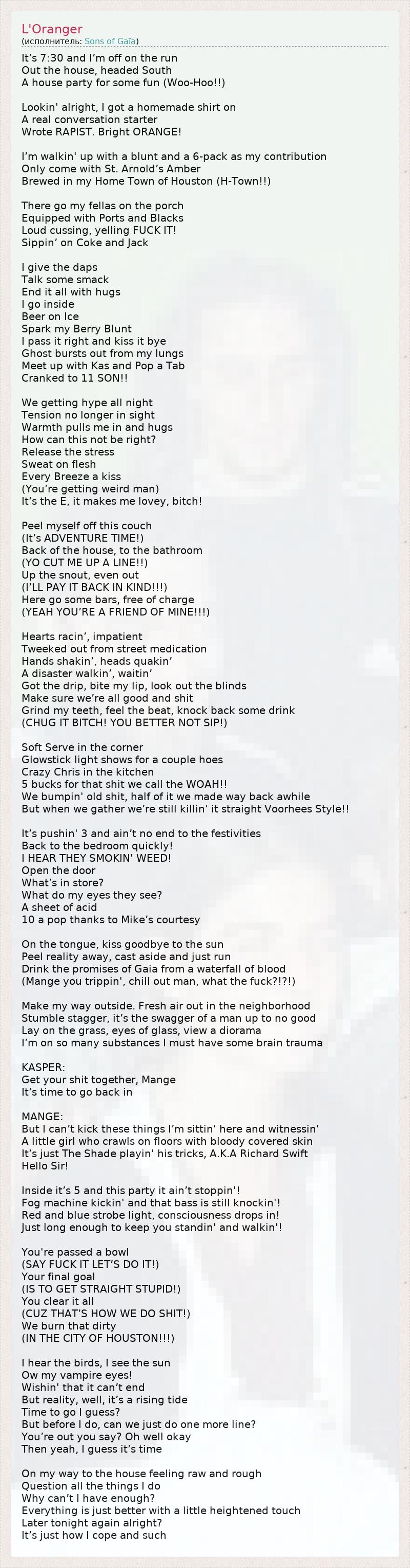 It’s 7:30 and I’m off on the run Out the house, headed South A house party for some fun (Woo-Hoo!!) Lookin' alright, I got a homemade shirt on A real conversation starter Wrote RAPIST. Bright ORANGE! I’m walkin' up with a blunt and a 6-pack as my contribution Only come with St. Arnold’s Amber Brewed in my Home Town of Houston (H-Town!!) There go my fellas on the porch Equipped with Ports and Blacks Loud cussing, yelling FUCK IT! Sippin’ on Coke and Jack I give the daps Talk some smack End it all with hugs I go inside Beer on Ice Spark my Berry Blunt I pass it right and kiss it bye Ghost bursts out from my lungs Meet up with Kas and Pop a Tab Cranked to 11 SON!! We getting hype all night Tension no longer in sight Warmth pulls me in and hugs How can this not be right? Release the stress Sweat on flesh Every Breeze a kiss (You’re getting weird man) It’s the E, it makes me lovey, bitch! Peel myself off this couch (It’s ADVENTURE TIME!) Back of the house, to the bathroom (YO CUT ME UP A LINE!!) Up the snout, even out (I’LL PAY IT BACK IN KIND!!!) Here go some bars, free of charge (YEAH YOU’RE A FRIEND OF MINE!!!) Hearts racin’, impatient Tweeked out from street medication Hands shakin’, heads quakin’ A disaster walkin’, waitin’ Got the drip, bite my lip, look out the blinds Make sure we’re all good and shit Grind my teeth, feel the beat, knock back some drink (CHUG IT BITCH! YOU BETTER NOT SIP!) Soft Serve in the corner Glowstick light shows for a couple hoes Crazy Chris in the kitchen 5 bucks for that shit we call the WOAH!! We bumpin' old shit, half of it we made way back awhile But when we gather we’re still killin' it straight Voorhees Style!! It’s pushin' 3 and ain’t no end to the festivities Back to the bedroom quickly! I HEAR THEY SMOKIN' WEED! Open the door What’s in store? What do my eyes they see? A sheet of acid 10 a pop thanks to Mike’s courtesy On the tongue, kiss goodbye to the sun Peel reality away, cast aside and just run Drink the promises of Gaia from a waterfall of blood (Mange you trippin', chill out man, what the fuck?!?!) Make my way outside. Fresh air out in the neighborhood Stumble stagger, it’s the swagger of a man up to no good Lay on the grass, eyes of glass, view a diorama I’m on so many substances I must have some brain trauma KASPER: Get your shit together, Mange It’s time to go back in MANGE: But I can’t kick these things I’m sittin' here and witnessin' A little girl who crawls on floors with bloody covered skin It’s just The Shade playin' his tricks, A.K.A Richard Swift Hello Sir! Inside it’s 5 and this party it ain’t stoppin'! Fog machine kickin' and that bass is still knockin'! Red and blue strobe light, consciousness drops in! Just long enough to keep you standin' and walkin'! You're passed a bowl (SAY FUCK IT LET’S DO IT!) Your final goal (IS TO GET STRAIGHT STUPID!) You clear it all (CUZ THAT’S HOW WE DO SHIT!) We burn that dirty (IN THE CITY OF HOUSTON!!!) I hear the birds, I see the sun Ow my vampire eyes! Wishin' that it can’t end But reality, well, it’s a rising tide Time to go I guess? But before I do, can we just do one more line? You’re out you say? Oh well okay Then yeah, I guess it’s time On my way to the house feeling raw and rough Question all the things I do Why can’t I have enough? Everything is just better with a little heightened touch Later tonight again alright? It’s just how I cope and such